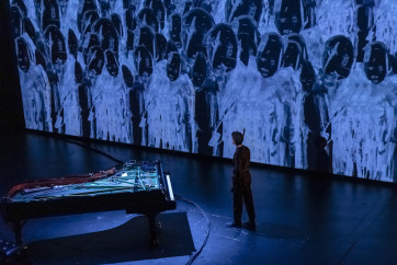 Comme elle aime le faire avec ses interprètes, Georgia Spiropoulos débute un travail de collaboration avec le pianiste-performeur Alvise Sinivia, ancien élève d'Alexandros Markeas, dans la classe d'improvisation générative. S'instaure alors cet échange fructueux entre les idées de la compositrice, qu'elle a fixées en amont, et le geste de l'improvisateur, sa propre énergie et son approche physique de l'instrument. Ainsi cette scène inaugurale puissante où le rideau se lève sur le pianiste en train de trainer son instrument avec de larges sangles – l'idée du labeur participe de la thématique – pour l'installer sur le devant de la scène. Il réitère six fois ce geste, correspondant aux six positions différentes de l'instrument sur le plateau et autant de séquences pianistiques où la vidéo parfois disparaît pour concentrer l'écoute sur le son. L'activité sur le clavier (jeu de trajectoires, irruption de clusters, etc.) et l'investigation sonore dans le « ventre » du piano, réclamant différents accessoires, relèvent autant de la gestualité induite par l'écriture que de l'improvisation-performance hors norme d'Alvise Sinivia. À ce titre, il est le « modèle prototypique » d'une œuvre sur laquelle chaque nouvel interprète pourra laisser son empreinte. Les gants à prothèses (des baguettes à chaque doigt) qu'il revêt en fin de parcours donnent lieu à l'une des séquences les plus sophistiquées, quoique très peu écrite, nous dit Georgia Spiropoulos. Car l'électronique live est à l'œuvre (Benjamin Lévy aux manettes), qui apporte sa dimension sonore et transformative, avec des capteurs placés aux endroits stratégiques de la caisse et des transducteurs démultipliant les capacités résonnantes du piano. Les séquences électroacoustiques (sons fixés) accompagnent, quant à elles, la vidéo, avec cette obsession de la sirène emblématique qui traverse toute la pièce. On y entend également à plusieurs reprises des voix, réelles ou de synthèse. Celle d'Alvise Sinivia jaillit dans l'élan du geste, à un moment clé de la trajectoire, entendue comme un cri supervisant le contexte bruyant de la partie pianistique.