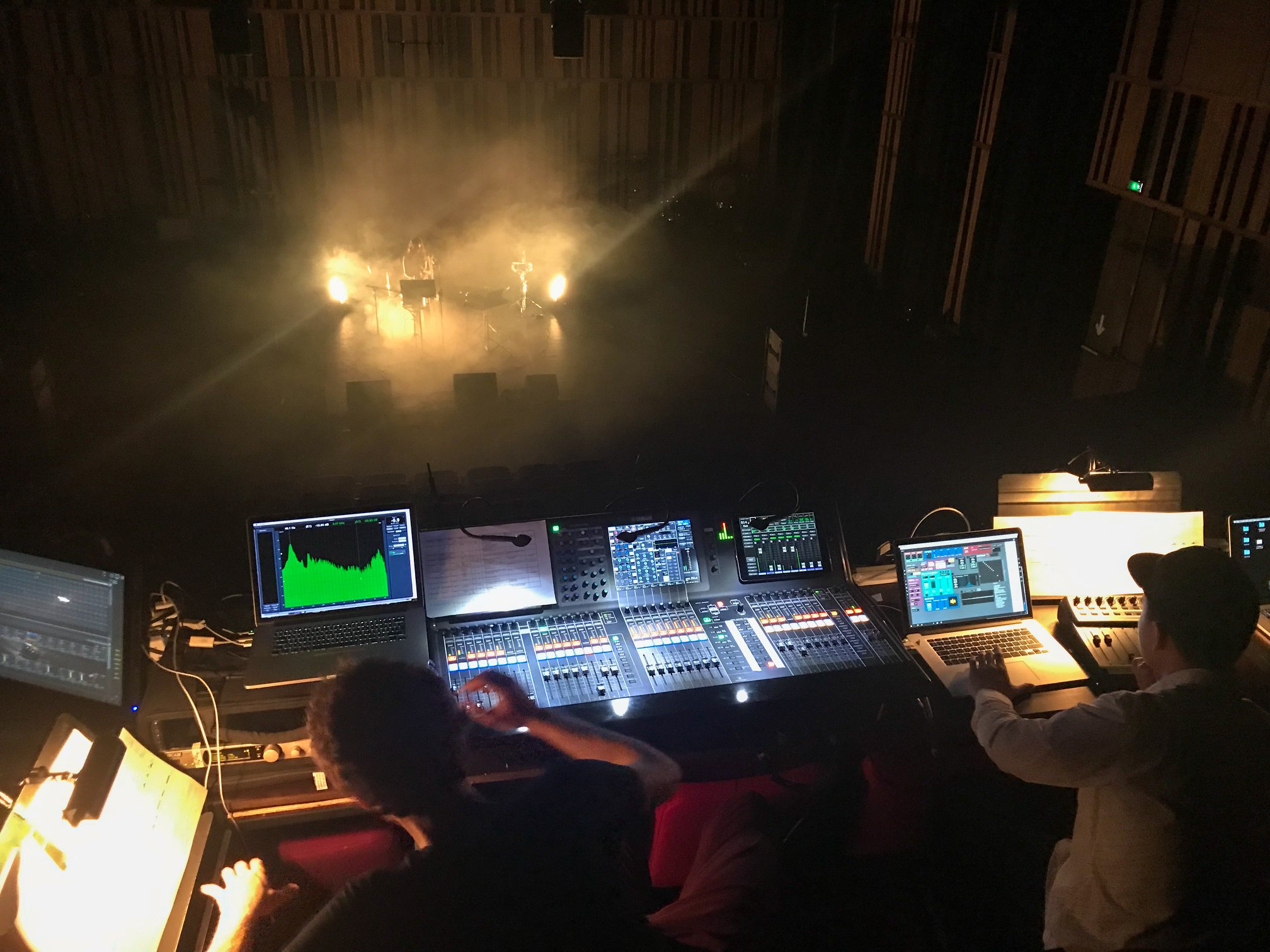 Dans Au-dessus du carrelage de givre, le New-yorkais Louis Goldford (Université de Columbia) s'intéresse aux relations de la poésie et de la musique à travers un texte écrit pour lui par la poétesse russe Katia Bouchoueva. Il est question d'un rêve dont l'électronique très foisonnante, associée à la vidéo, tente de traduire le flux onirique. Moins convaincante est la partie vocale, entre lyrisme, voix parlée et déclamation, bien défendue cependant par le ténor Benjamin Athanase. Avec Technotope, le Français Florent Caron Darras explore les relations organiques entre le son de l'instrument (le saxophone baryton de Nicolas Arsenijevic) et la partie électronique. La performance bien conduite se joue en temps réel, procédant à l'embrasement progressif de l'espace jusqu'à ce que les sons synthétiques fonctionnent en autonomie. Le flux de slaps énergétiques et ses effets de rebonds spatialisés constituent une coda de toute beauté. Le Chinois Jialin Liu a l'idée de construire, avec un programme de synthèse ad hoc, une tour virtuelle, dédiant sa pièce, shh… you're in the tower I built you, à… la flèche de Notre-Dame de Paris : un travail ambitieux sur la dimension verticale du son et ses mouvements giratoires dans l'espace, à la faveur de quatre micros cernant l'espace de jeu de l'instrumentiste. C'est l'univers des micro-intervalles et la notion de tempérament qui guident les recherches de l'Allemand Konstantin Heuer dans unbound explorations. Aussi a-t-il choisi la viole de gambe dont il peut librement modifier la position des frètes. Mais on ne perçoit pas véritablement le lien qui s'établit entre l'instrument (Sumiko Hara), la danse (Matéo Lagière) et l'électronique.