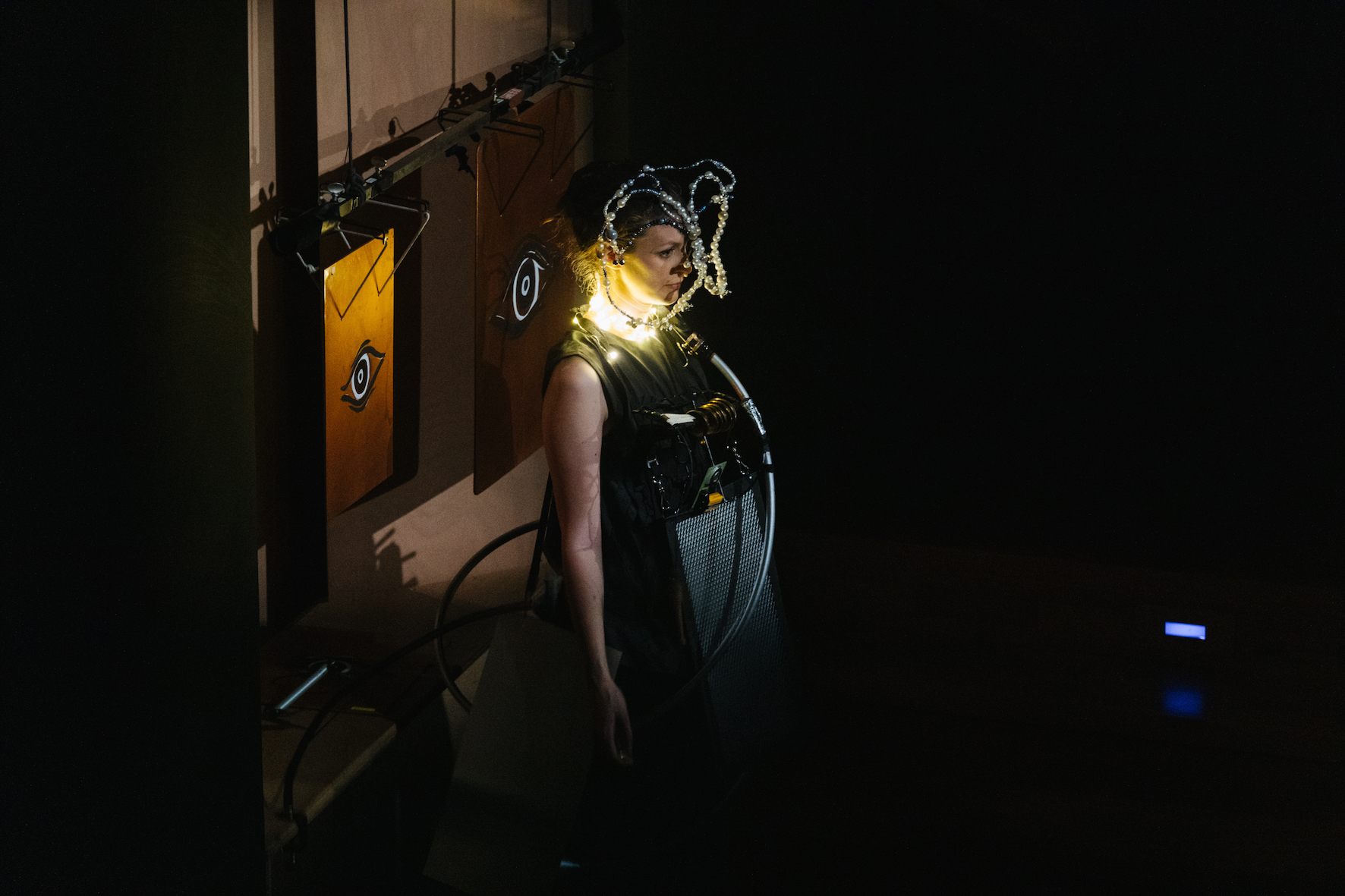 Pour l'heure, et dans une salle des concerts bondée, quatre groupes de cuivres rehaussés de percussions résonnantes sont répartis dans les galeries supérieures pour le Salut bien sonnant. Les musiciens du Conservatoire régional de Paris épaulent ceux du Balcon, tout de noir vêtus dans cette fanfare inaugurale plutôt sombre et lancinante, où sept trombones (l'instrument de Lucifer) font entendre leurs glissades dépressives. Rappelons que Lucifer est frère de Michael et s'oppose à lui en tant qu'esprit de rébellion, qui nie et ne connaît pas l'amour. Dans le système codifié de Stockhausen et la symbolique des nombres qui infiltre toute l'écriture de Licht, le 13 est associé à Michael et le 11 à Lucifer (la somme de 24 n'est sans doute pas anodine). Comme dans Donnerstag, les personnages sur scène comptent très fréquemment plus qu'ils ne parlent ou ne chantent. Pianiste mais aussi acteur et performeur impressionnant, qui donne également de la voix, Alphonse Cemin en toge noire est aux côtés de la basse Damien Pass dans la première scène de Samstag, Le rêve de Lucifer associant couches temporelles et strates lumineuses. Le pianiste interprète rien moins que le Klavierstück XIII de Stockhausen, une pièce de trente-cinq minutes théâtralisée par le compositeur, dont l'écriture puissante, inventive et habitée incarne l'esprit créateur de Michael. Lucifer, engoncé dans son sofa, s'est endormi et feint la mort.