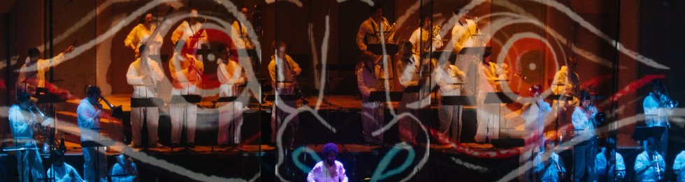 Paris. Cité de la Musique, Salle des concerts et église Saint-Jacques-Saint-Christophe. 28-VI-2019. Karlheinz Stockhausen (1928-2007) : Samstag aus Licht, opéra en cinq parties. Direction scénique : Damien Bigourdan. Création visuelle : Nieto. Projection sonore : Florent Derex. Costumes : Pascale Lavandier. Scénographie : Myrtille Debièvre. Création lumière : Catherine Verheyde. Avec : Damien Pass, Lucifer ; Alphonse Cemin, piano, joueur du rêve de Lucifer ; Claire Luquiens, flûte, chat noir Kathinka (scène 2) ; Julie Brunet-Jailly, flûte, chat noir Kathinka (scène 3) ; Alice Caubit, percussions, la vue ; Akino Kamiya, percussions, l’ouïe ; Frédéric Blondy, percussions, l’odorat ; Arthur Lavandier, percussions, le goût ; Othman Louati, percussions, le toucher ; Clotilde Lacroix, percussions (la pensée) ; Emmanuelle Grach, danseuse à rubans ; Henri Deléger, trompette (Michael) ; Mathieu Adam, trombone, un diable à trombone ; François-Xavier Plancqueel, percussions ; Ayumi Taga, orgue ; Alain Muller, chef de chant, claviers ; Émilie Fleury, cheffe de chœur. Direction et conception du spectacle : Maxime Pascal