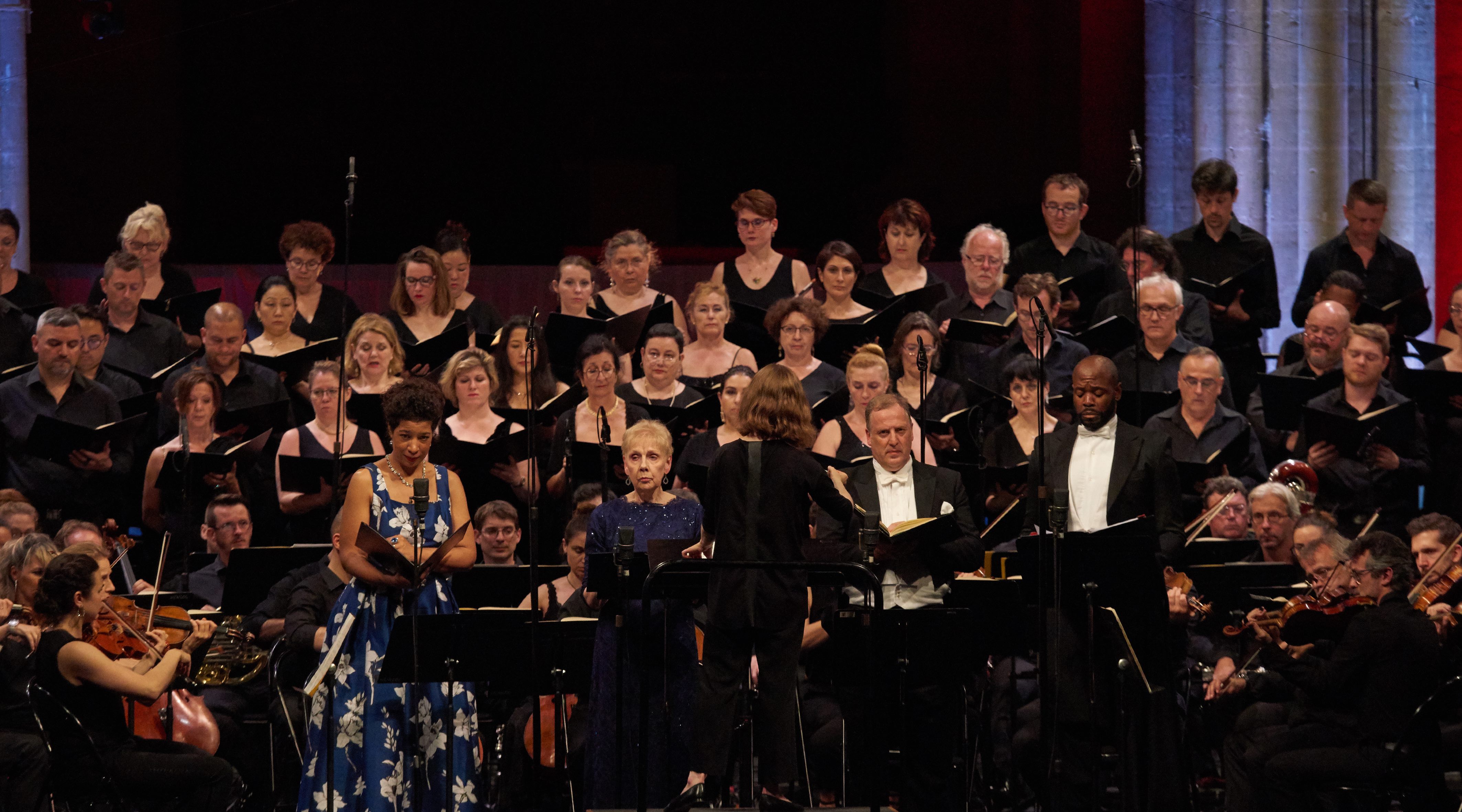 On attend donc l'entrée des quatre solistes pour aborder l'oratorio de Michael Tippett, A Child of Our Time, écrit par le compositeur anglais à la suite des évènements de la nuit de Cristal. Peut-être la chaleur extérieure a-t-elle perturbé une partie des musiciens, car même si le hautbois sonne moins aigre qu'en première partie et que les cordes, sous la première violon Sarah Nemtanu, offrent parfois un beau nappage sous le chœur, la tenue de l'orchestre français dans les mains de la lituanienne ne fascine jamais vraiment, en plus de montrer de nombreux décalages ou approximations. Le Chœur de Radio France, exercé dès janvier 2018 avec Sofi Jeannin aux cinq spirituals de l'œuvre, est cette fois préparé par le spécialiste anglais Edward Caswell. Il introduit la première des trois parties sur l'idée que le monde se tourne du côté obscur, suivi par la mezzo-soprano Felicity Palmer. Si la voix se montre régulièrement instable et moins facilement audible lorsqu'elle descend dans le grave, elle offre encore du poids au texte. Bien soutenue par la flûte lors de l'Argument, elle est ensuite bien accompagnée par le chœur à l'Interlude.