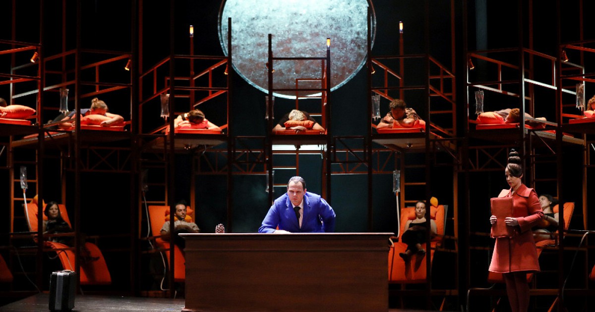 Aix-en-Provence. Théâtre du jeu de paume. 6-VII-2019. Adam Maor (né en 1983) : Les mille endormis, sur un livret de Yonatan Levy. Mise en scène : Yonatan Levy. Scénographie : Julien Brun. Costumes : Anouk Schiltz. Lumière : Omer Shizaf. Réalisation informatique musicale Ircam : Augustin Muller. Avec : Tomasz Kumięga, le Premier Ministre ; Gan-ya Ben-gur Akelrod, Nourrit ; David Salsbery Fry, sous-chef du service général de la sécurité ; Benjamin Alunni, une voix du monde, le ministre de l’agriculture, un manifestant, un Cantor. United instruments of Lucilin, direction : Elena Schwarz