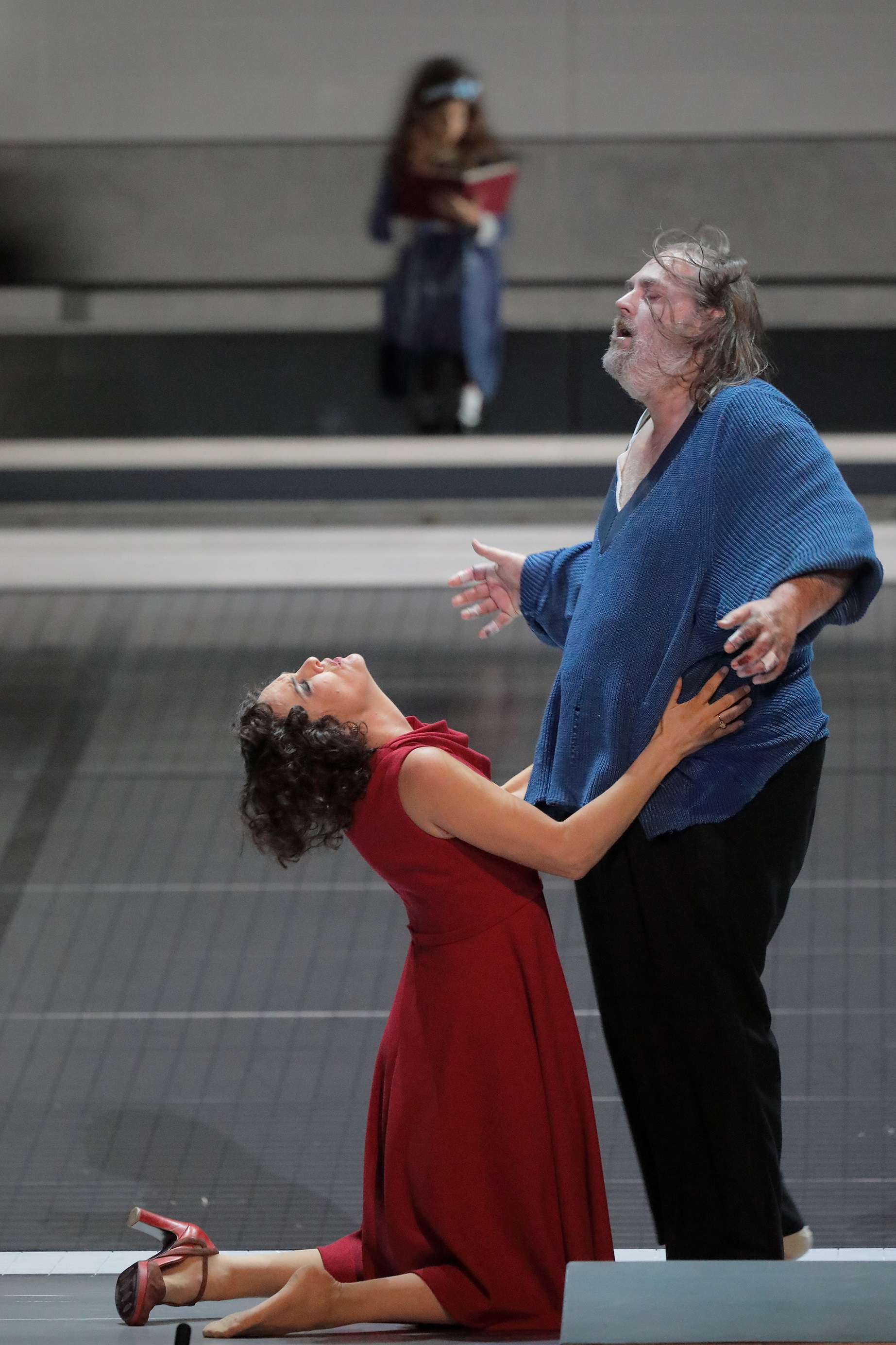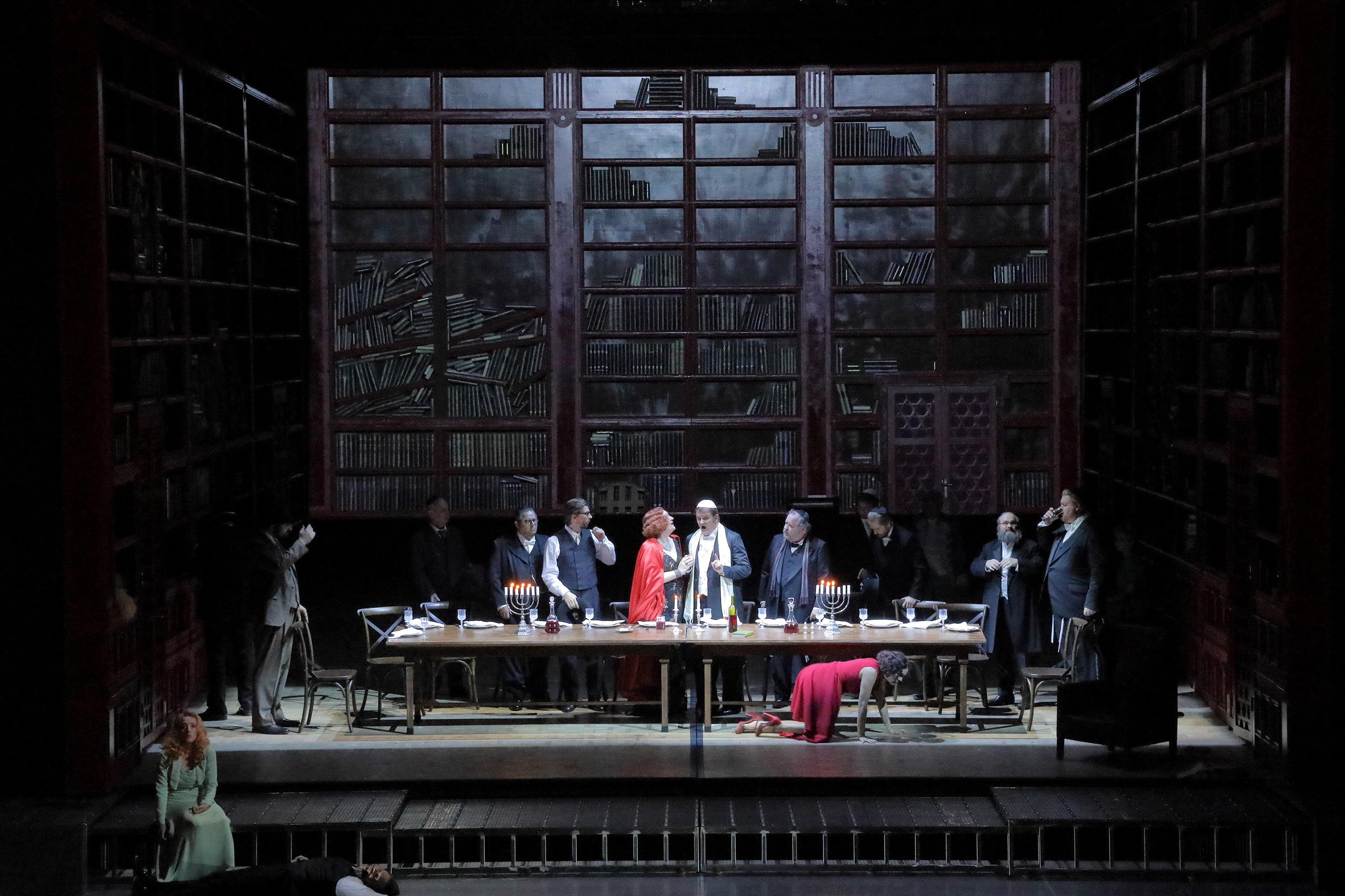 La mort, donc. Elle est présente dès le prologue ajouté par Warlikowski, où une petite société bourgeoise écoute un des déchirants Kindertotenlieder de Mahler caricaturé en un sketch de cabaret jusqu'à ce que la brutalité de coups frappés à la porte la mette en panique. Warlikowski y décrit les derniers feux des sociétés juives assiégées par la barbarie nazie ; ce petit groupe humain captif et rongé par l'inquiétude cherche à maintenir les rites bourgeois, le culte de l'apparence, le décorum des grands dîners, frappe pourtant bien au-delà de l'anecdote – le couple central formé par Wolfgang Ablinger-Sperrhacke et Michaela Schuster construit son interprétation en conséquence : ils sont loin de la caricature souvent mise en scène, que ce soit dans leur jeu ou dans leurs voix. Salomé, dans ce contexte, est celle qui perturbe les rites, moins par révolte ou par esprit de liberté que comme une réaction presque pathologique – c'est avec la mort qu'elle danse, représentée par le vétéran du Ballet de Bavière Peter Jolesch, d'une puissante présence scénique.