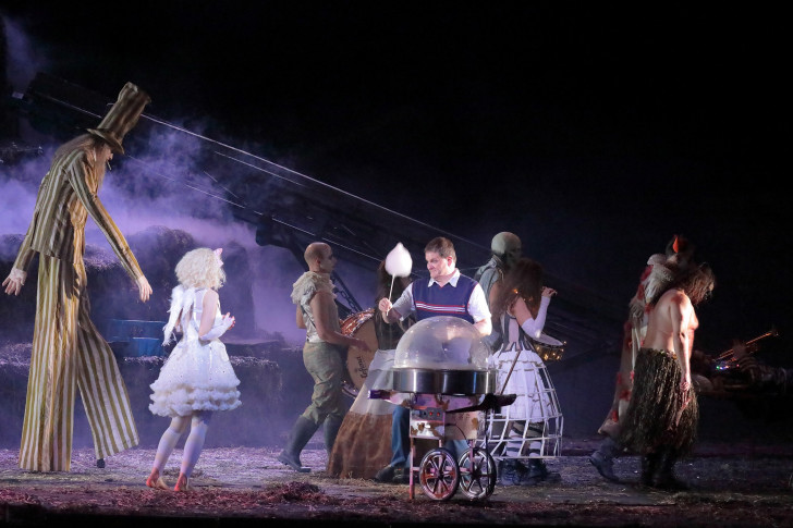 La fiancée vendue de Bedřich Smetana n'est certainement pas la plus drôle ni la plus émouvante des comédies lyriques, et il lui faut bien le soutien d'un metteur en scène ambitieux pour donner des contours à ses personnages. David Bösch n'est pas l'homme des grands concepts, mais il s'entend mieux que personne à donner une humanité chaleureuse et touchante aux êtres de papier que l'opéra met souvent sur scène. Ici, point d'idylle rurale : la campagne qu'il nous fait voir a tout le prosaïsme utilitaire que les urbains n'aiment pas y voir ; le spectaculaire décor construit par Patrick Bannwart est occupé pour l'essentiel par un gigantesque tas de fumier, amplification comique de ce qu'on pouvait encore voir dans nos campagnes il n'y a pas si longtemps. Nulle caricature ici : Bösch ne masque rien de ce monde, odeurs comprises (mais sans projection olfactive vers la salle, fort heureusement), mais la tendresse de son regard est tout ce qui fait le prix de son travail, qui donne une personnalité au moindre choriste.