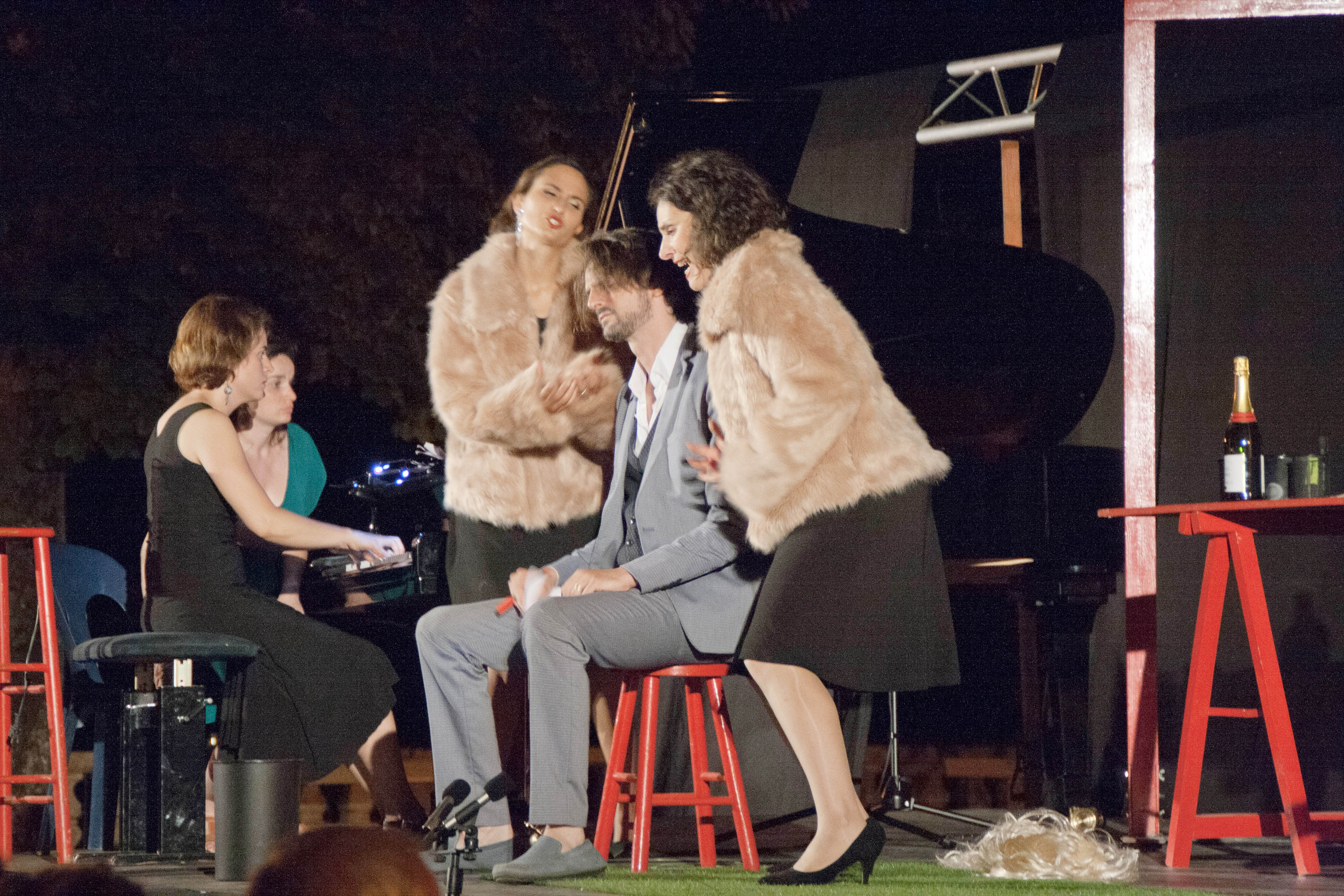 Deux sopranos rivales et de tempéraments opposés sont convoquées par leur agent pour une audition devant un directeur de théâtre en panne de chanteuse pour un rôle invraisemblable et elles se retrouvent évidemment ensemble. Quiproquos, querelles, schizophrénie du directeur, burn out de l'agent, Emmanuel Gardeil s'en donne à cœur joie pour égratigner non seulement les caprices de divas, mais toutes les outrances et les travers exacerbés du monde lyrique, tout en soulignant les difficultés et les galères de ce métier. Sur scène, le piano d'Émilie Véronèse donne le ton et le rythme enlevé, tandis que mozartiennes accomplies, Clémence Garcia et Corinne Fructus se jouent avec délices des partitions de Wolfgang et révèlent un beau talent de comédiennes dans le registre comique. Du côté masculin, la basse Julien Bréan nous séduit vocalement en interprétant un agent artistique au bord de la crise de nerf, tandis qu'Emmanuel Gardeil, lui-même baryton, campe un irrésistible directeur survolté, dont les idées et les concepts se bousculent dans des méandres qu'il ne parvient plus à suivre.