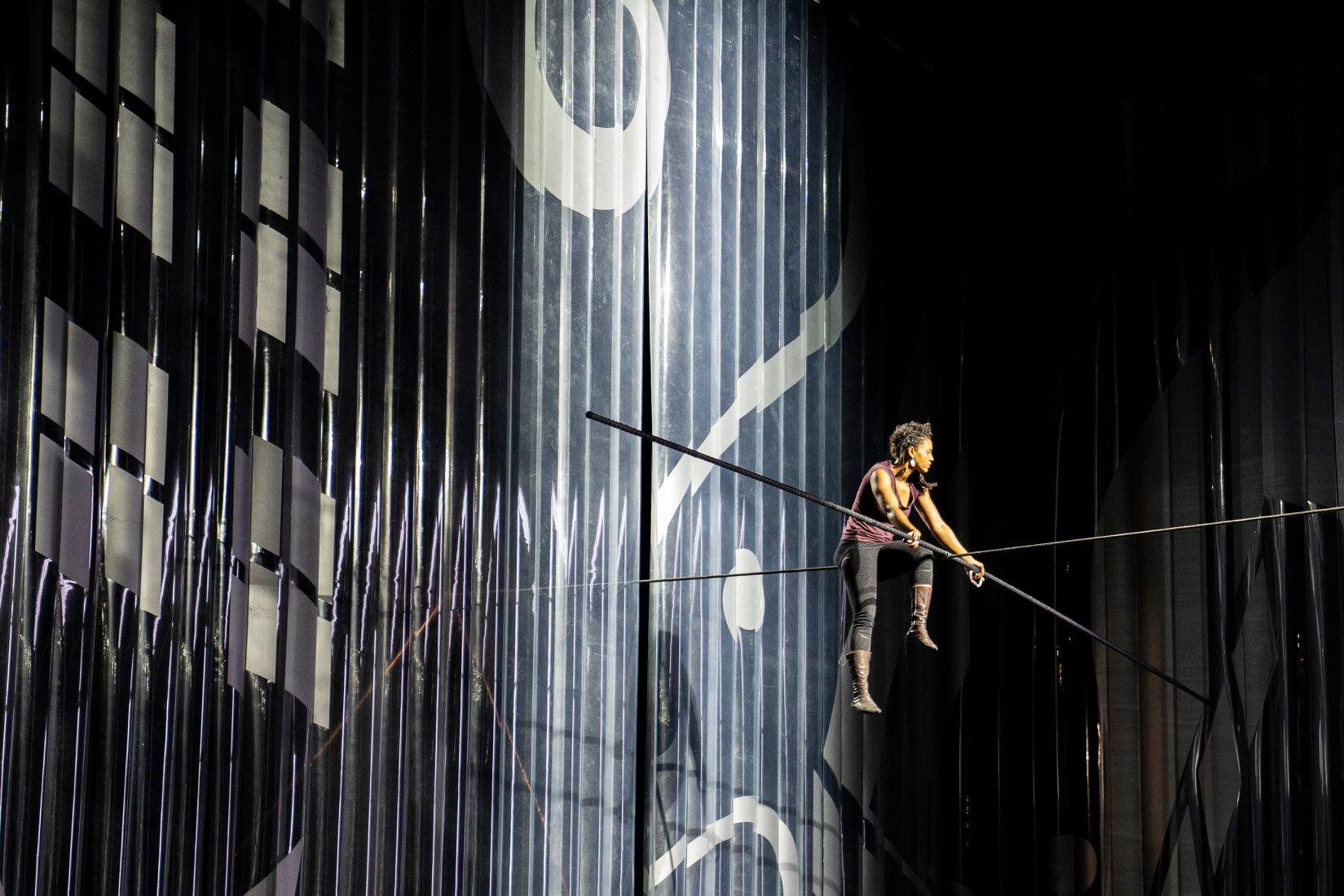 Sur son fil, l'élégante Tatiana-Mosio Bongonga danse sous l'incitation des interprètes. Après sa prestation sidérante sur la barre russe, Alexandra Royer, également spécialiste du cercle aérien, évolue dans l'espace en synergie avec les voix galvanisantes de DakhaBrakha.