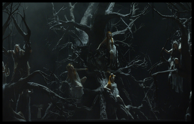 Pour mettre en espace cette fantasmagorie conçue dans la continuité d'une partition en un seul tenant – près de deux heures de musique -, la mise en scène à la fois sobre et efficace de Thomas Jolly exploite à l'envi les effets d'un plateau tournant alternant trois décors « gothiques » dus à Bruno de Lavenère : une forêt insondable en permanente évolution, avec ces arbres foudroyés et défeuillés tels des crânes fracassés, les ruines d'un théâtre abandonné, et le château infernal tournoyant sur lui-même, évoqué tant par sa porte monumentale que par son escalier à double révolution. Sous les éclairages très sombres d'Antoine Travert, émerge des profondeurs les plus noires – dignes d'un tableau de Soulages – un rougeoiement de plus en plus intense au fil de l'action. Le spectateur est saisi à la gorge par l'atmosphère suffocante et captivante de ce maelström scénique et musical, fascinant tant par sa violence larvée que par sa puissance spectrale très évocatrice.