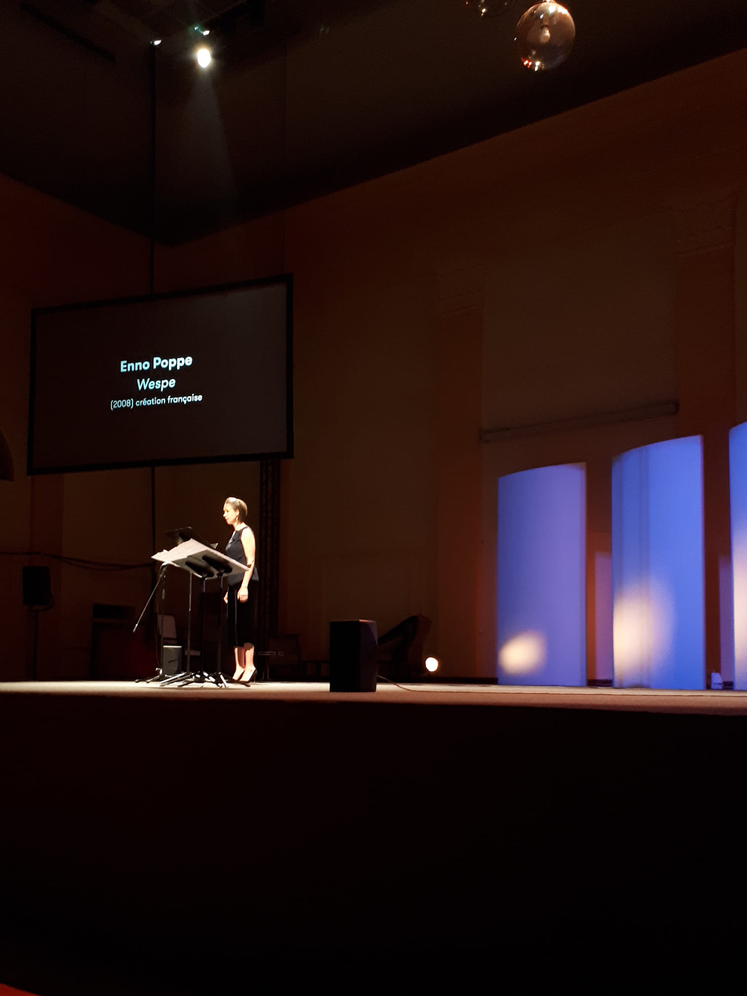 Le rendez-vous est plus traditionnel et le ton confidentiel, le lendemain, dans la salle de la Bourse, avec la soprano britannique Juliet Fraser (membre de l'ensemble Exaudi) et sa partenaire flûtiste Helen Bledsoe. Cinq œuvres à fleur de lèvres (et autant de créations françaises) sont au programme dont trois partitions de la londonienne Rebecca Saunders mise à l'honneur durant ce week-end. La voix est ductile et l'espace vibratile dans O, une pièce écrite à partir d'esquisse de Skin pour soprano et ensemble, que Juliet Fraser chante au bas de l'estrade. Un travail très fin est exercé au niveau de l'émission vocale et de la variation du timbre au sein d'une trajectoire quasi hypnotique. La voix oscille, ondule, vibre et tremble dans Wespe (Guêpe) d'Enno Poppe qui pétrit le texte à sa fantaisie. Adiantum Capillus-Veneris pour voix et respiration amplifiée de Chaya Czernowin est une « étude de fragilité », jouant sur les fluctuations d'une matière-énergie à la marge du son et de la couleur, dont Juliet Frazer détaille superbement les micro-variations. Dans Bite pour flûte basse amplifiée de Saunders, Hélène Bledsoe articule un discours sans mot où le souffle interfère avec la voix de l'interprète. Les deux instances, voix et flûte basse, sont réunies, s'hybrident et fusionnent dans O yes & I, où la compositrice mêle les mots de Joyce (le monologue de Molly Bloom) et ses propres exhortations.