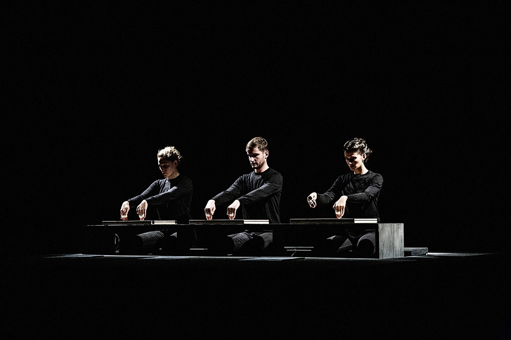 Le dimanche 29 septembre est une journée consacrée à Thierry De Mey au Point d'eau, à Ostwald. Elle commence par la magnifique interprétation de Musique de tables par trois comédiens qui exécutent avec une virtuosité et une précision à couper le souffle cette partition ancienne du compositeur (1987) : Éléonore Auzou-Connes, Emma Liégeois et Romain Pageard. Comme une miniature de la vie en société, ils se suivent, s'imitent, se distinguent, se concurrencent, s'associent, se séparent, s'affrontent et se retrouvent. La simplicité du dispositif n'empêche en rien la puissance de l'effet produit sur le spectateur, bien au contraire.