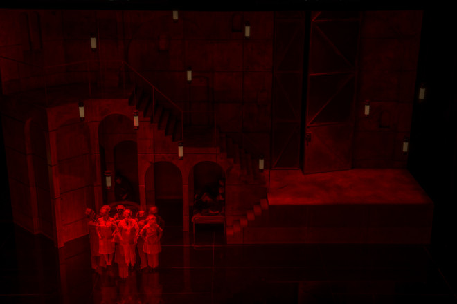 La mise en scène d'Olivier Lexa est réaliste, dans un décor épuré mais menaçant, avec des costumes quasi gothiques (réalisés par les étudiants en scénographie auprès de l'École nationale supérieure des Arts Visuels de la Cambre) et sous les éclairages d'Alexander Koppelmann tantôt très sombres tantôt d'une aveuglante puissance. Elle ne surligne jamais la trame dramatique et laisse outre une part de non-dit au silence des humbles et des ordres invisibles, une vaste emprise à l'imaginaire du spectateur, par exemple par un habile jeu d'ombres chinoises (La mort de Tintagiles, Alladine et Palomides) ou par quelques projections de tout ou partie de tableaux évocateurs (volet central de l'Agneau Mystique de van Eyck, Ophélie de Millais, toiles de Füssli). Une courte vidéo de Simon Van Rompay contre-pointe également la mise en espace d'Intérieur, le « mélodrame » central : dans ce film, tous les personnages du spectacle se croisent, comme dans un mauvais rêve, dans une chambre d'asile sous le regard du corps médical. L'évocation de la folie y côtoie celle de la pulsion de mort la plus criminelle en totale opposition avec la douceur inquiétante et étrange de l'action théâtrale ; un procédé « fugué » qui explicite la violence inconsciente ou refoulée du texte et des situations dramatiques.
