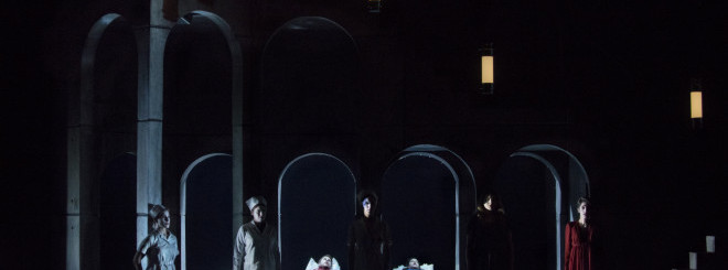 Bruxelles. Théâtre royal flamand (KVS). 29-IX-2019. Benjamin Attahir (né en 1989) : le silence des ombres (La mort de Tintagiles, Intérieur, Alladine et Palomides), d’après les trois petits drames pour marionnettes de Maurice Maeterllinck. Mise en scène : Olivier Lexa. Décors et costumes : étudiants de la section scénographie de l’Ecole nationale supérieure des arts visuels de la Cambre, encadrés par Véronique Leyens et Simon Siegmann. Éclairages : Alexander Koppelmann. Film (pour Intérieur) : Olivier Lexa et Simon van Rompay. Avec : Julia Szproch (Tintagiles, Alladine), Raquel Camarinha (Ygraine, Marie, Astolaine), Pierre Derhet (le Paysan, Palomides), Renaud Delaigue (Aglovale, Ablamore ), Clémence Poussin (Bellangère, Marthe, Troisième sœur de Palomides), Morgane Heyse (première servante, première sœur de Palomides), Gwendoline Blondeel (deuxième servante, deuxième sœur de Palomides), Sarah Théry (Troisième servante, quatrième sœur de Palomides), Sébastien Dutrieux (l’étranger, le médecin), Luc Van Grunderbeeck (le vieillard). Orchestre de chambre de la Monnaie, Benjamin Attahir : direction