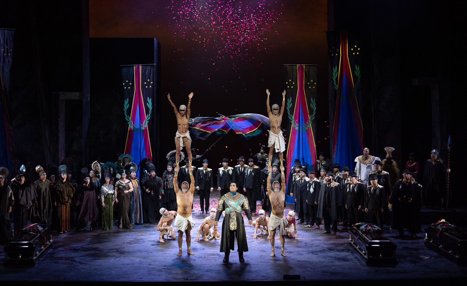 A la sortie de l'opéra, les spectateurs reçoivent un petit opuscule édité par la Fondation Gandur pour l'Art. Une trentaine de pages richement illustrées qui nous apprend plus sur les personnages qui peuplent l'opéra de Verdi que dans le programme de la soirée, et plus encore que dans le spectacle lui-même. Parce qu'en effet, côté Égypte et ses pharaons, on se perd en conjectures quant aux sources inspiratrices du metteur en scène britannique Phelim McDermott. Les quelques égyptologues présents ont dû s'étouffer à la vue de cette Égypte de bazar. Même la pauvre Aïda, quand bien même elle est une esclave éthiopienne, n'aurait pas reconnu un seul de ses maîtres d'alors. Devant une pas tout à fait pyramide ni tout à fait obélisque, comment s'y retrouver avec un messager costumé comme un aviateur de ligne une cape de feuille d'or couvrant les épaules de son veston, des soldats ressemblant à une bande de Robocop ? Des prisonniers semblant revenir d'une journée de récolte de patates alors que Radamès arbore fièrement un pantalon des « bleus » de la Guerre 14-18 ? Un roi, chauve au crâne peint d'or, en toge blanche et ses gens du peuple coiffés de feutres à-la-Bogart complétant le tableau des protagonistes ? Jusqu'à cette prêtresse issue d'Alice au Pays des Merveilles, sous la robe de voiles rouges écarlate de laquelle s'extirpe un groupe d'acrobates de cirque plus incongrus qu'une troupe d'éléphants roses. Et les voici qui se dandinent, qui dansent lascivement autour de quatre cercueils de soldats tombés au combat avant de s'agripper les uns aux autres pour former l'arc de triomphe d'un Radamès rentrant victorieux de ses batailles. Du disparate, des pièces rapportées comme sorties de la boîte à jouets d'un enfant. Des personnages qu'il aurait ensuite alignés pour se raconter une histoire que lui seul comprendrait.