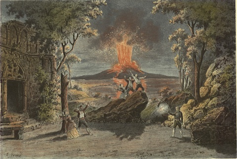 La partie intitulée « La révolution en marche » développe les bases du Grand Opéra, posées dans La Muette de Portici (créée en 1828) : une structure en cinq actes, une scénographie imposante, une présence importante des ballets ; ce tournant dans l’histoire musicale est évoquée= par les dessins de costumes de La Muette, la partition ouverte sur « Amour sacré de la patrie » (air connu pour avoir suscité le soulèvement du peuple ayant engendré la révolution belge), un très beau dessin de la mise en scène et les plans du chef machiniste de l’éruption du Vésuve. Guillaume Tell de Rossini (créé en 1829) utilisera de son côté la narration de la révolte du peuple suisse qui engendra la naissance de la confédération helvétique.