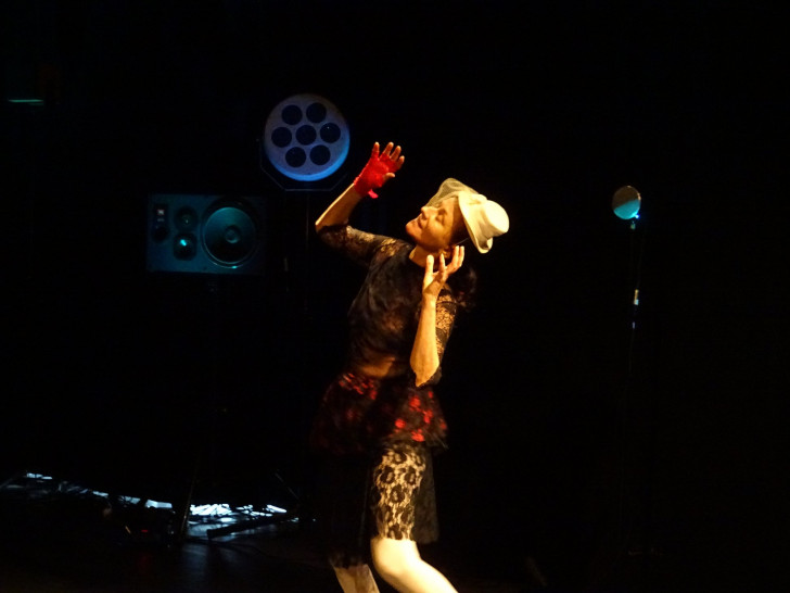 Doyen de ce festival, Pierre Boeswillwald, compositeur octogénaire des plus dynamique, est à la console pour interpréter Dans le trou odieux de la bête appelée algorithme, une musique au large spectre, articulée en plusieurs séquences, dont la puissance et le caractère onirique impressionnent. Elle donne lieu à la proposition chorégraphique la plus risquée et spectaculaire de la soirée. Un bas de laine sur le visage, la main droite entravée par un gant de cuir noir, le corps anonyme – la danseuse et chorégraphe Maite Soler – se tient en retrait dans le noir. Seule sa main droite capte la lumière (celle de Cloé Chope, rappelons-le), réagissant aux propositions sonores par un geste minimaliste mais non moins expressif : une autre manière d'instaurer le dialogue avec les sons fixés, aussi visionnaire que convaincante.