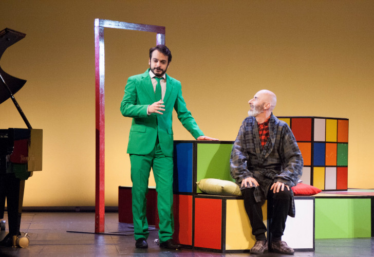 Sur un plateau à décor unique très dépouillé, fait de portiques amovibles et de niveaux différents à la façon de rubik's cubes, manipulés par un vaillant factotum, figurant également le valet et le notaire (Louis Sainrat), on reconnaît le style d'Emmanuel Gardeil dans une mise en scène épurée, énergique et très rythmée, doublée d'une fine direction d'acteurs. Pour une meilleure compréhension, il a réécrit des dialogues en français, contemporains et d'une grande drôlerie, qui font la joie du public. Il transforme quelque peu le final par un épilogue de réconciliation totale où un an plus tard, Don Pasquale, remis de sa coûteuse déconvenue, devient un charmant grand-oncle pour l'enfant d'Ernesto et Norina.