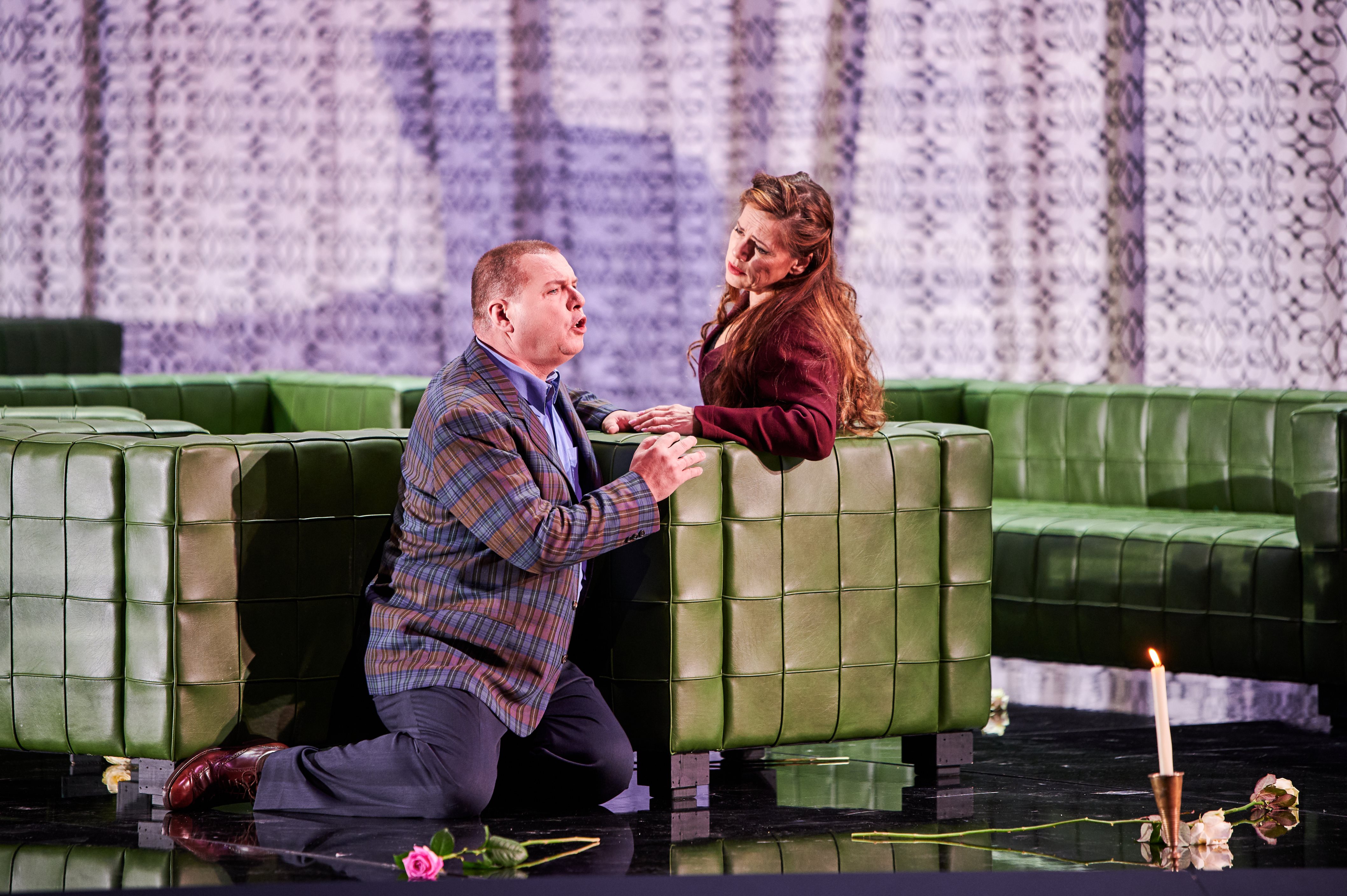 La mise en scène de Christopher Alden, créée en 2016, fait le pari du décor unique (on reconnaît la signature de Paul Steinberg, collaborateur fréquent de Christopher comme de David Alden), et il le tient brillamment, entre autres parce qu'il n'essaie jamais de meubler : on peut penser ici à la mise en scène de Christoph Marthaler à Bayreuth, « tragédie de l'écoute » (pour reprendre une expression de Luigi Nono) qui faisait des mots le véritable objet du duo d'amour. Les différences avec ce spectacle majeur sont pourtant considérables : l'espace scénique de vaste salon d'attente, surchargé de gros meubles cossus et laids, ouvert sur la droite par une grande véranda, n'évolue pas beaucoup, mais Alden sait lui donner une présence physique : sa direction d'acteurs subtile se sert de toutes les possibilités qu'il offre pour construire des situations et des personnages, parfois en décalage par rapport à la lettre de l'œuvre, mais de manière toujours significative.