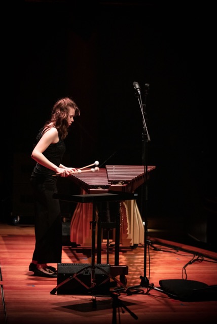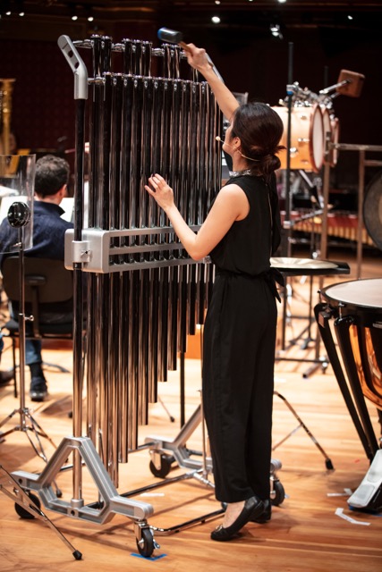 Comme pour Marianna, on ajuste la hauteur et la place des instruments pour Hyeji Bak dont l'autorité de la voix et du geste saisit d'emblée. On est séduit par l'éclat du son, due à la précision et la vivacité de l'attaque, dans le premier solo sur les petits tambours de bois qu'elle fait crépiter de manière inouïe. Elle est la seule à jouer en virtuose avec les cloches tubes dont elle doit varier la résonance. Comme dans son programme libre, la sonorité lumineuse qu'elle tire du marimba impressionne, tout comme l'aisance du geste et sa dimension théâtrale, efficace mais toujours contenue.