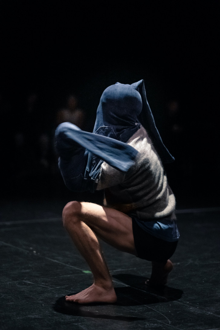 Dans Body of work, en deuxième partie de soirée dans la salle du haut, Daniel Linehan renoue avec la simplicité et l'efficacité de ses premiers solos, avec quelques années en plus. Il aime toujours jouer avec les mots, le corps et les concepts dans ce solo économe en moyens (un micro, un tabouret et une boucle sonore). Utilisant son corps comme mètre étalon, il puise dans ses ressources propres pour construire une partition sonore et corporelle originale. De ce fait, il offre une présence intense au monde, car chaque geste, dans sa précision, recèle une intention. Il inclut les spectateurs, disposés autour de l'espace scénique rectangulaire, en distribuant des baisers. La qualité de sa danse et son impressionnante maîtrise font le reste !
