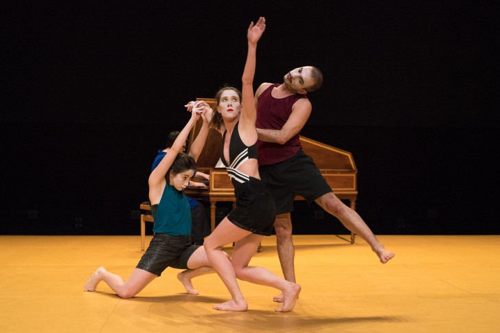 Pour cette Forme simple, l'écriture précieuse de Loïc Touzé explore le vocabulaire baroque avec malice pour mieux s'en affranchir. On aura rarement (voire jamais ?) vu un clavecin sur le plateau du bas du Théâtre de la Bastille. Quinze des trente Variations Goldberg y sont jouées avec délicatesse par Blandine Rannou et servent de terrain de jeu aux trois interprètes, aux visages maquillés de blanc. Dans une stylisation qui oscille entre japonisme et Grand Siècle, les danseurs tissent avec lenteur leur partition chorégraphique, teintée de pantomime et d'acrobaties. L'écriture est subtile et fine, jouant avec les harmonies et le contrepoint de Bach, mais en prenant son temps. Une très jolie surprise !