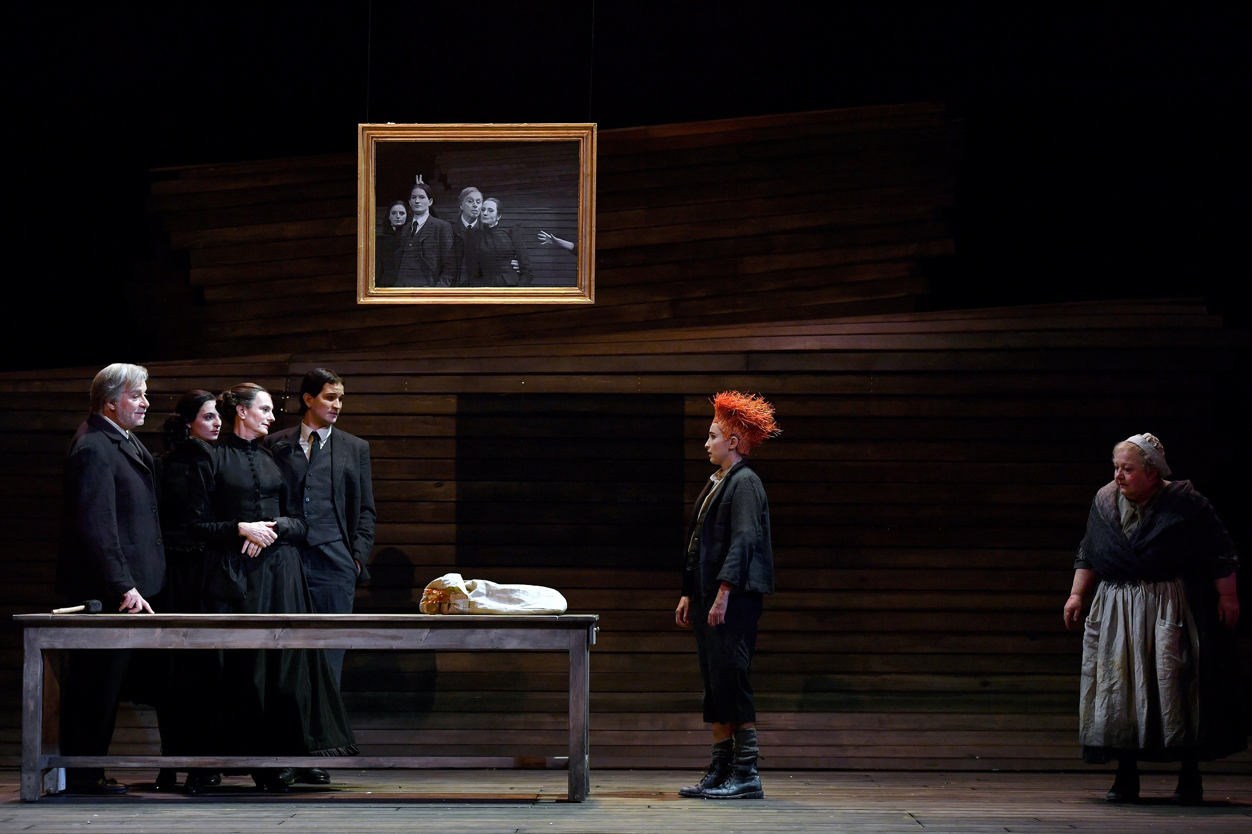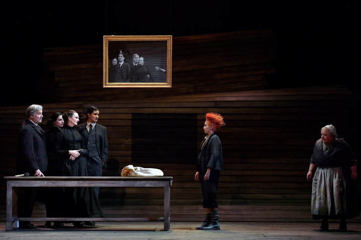 La première vision qui ouvre le beau livre d'images relié par Zabou Breitman est celle d'un champ de Poil de Carotte poussés du sol et dont n'émerge que des tignasses rousses plantées sur un plancher mouvant qui s'élève poétiquement vers le fond du plateau : une vague de lattes dont les replis seront parfois utilisés par les personnages à la manière d'un castelet de marionnettes. Le premier plan, posé de guingois, est dédié à différents travellings mobiliers : lit, table, clapier, âtre… Dans ce décor poétiquement arraché à la pesanteur du prosaïsme, des costumes sombres rappellent l'année de la parution du roman (1894) et disent la ténébreuse histoire de l'enfance écartelée par le désamour, celle, autobiographique, du petit Jules, enfant roux lui aussi, blondissant progressivement, raconta-t-il plus tard, à l'arrivée de la bonté dans son existence ! Les tableaux se succèdent (superbe Jour de l'an avec sa longue chute de neige) dans le cadre fixé, au propre comme au figuré, par la merveilleuse scène introductive chorégraphiée, intitulée Les Lepic, qui montre la dysfonctionnelle famille préoccupée de fixer sur pellicule chacun de ses membres. En bande organisée, elle écarte l'enfant roux du cliché, l'incitant à glisser à son tour vers une certaine barbarie.