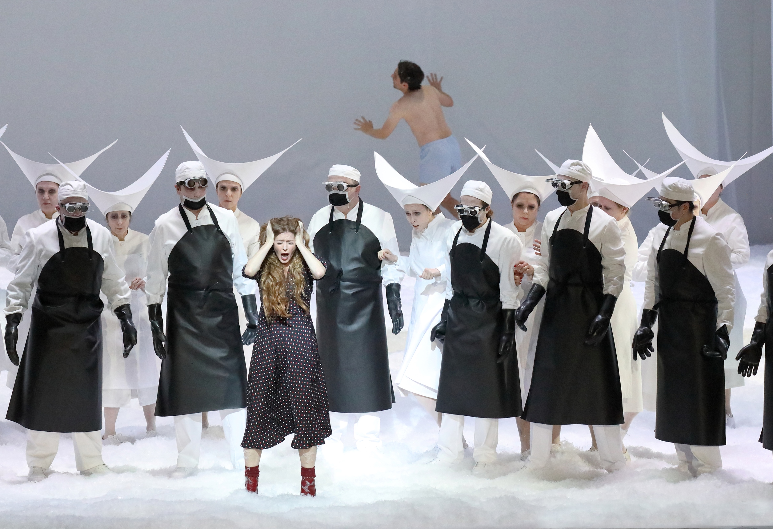 La mise en scène d'Andreas Kriegenburg tient compte du fait que l'opéra d'Abrahamsen ne se veut aucunement un opéra pour enfants. Le rôle de la Reine des Neiges est composé pour une basse, ici Peter Rose : le compositeur entend ainsi en faire non une incarnation du mal, mais une figure plus ambivalente, Sarastro plutôt que la Reine de la nuit. Le personnage est trop épisodique pour prendre une telle consistance, et on pourrait aussi bien voir dans sa relation avec Kay comme une emprise pédophile.