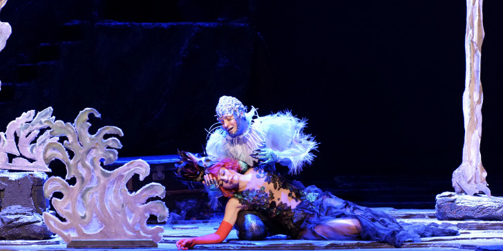 Tellement sous le charme de la musique, on en oublierait presque le foisonnant metteur en scène colombien, déjà réalisateur d'une petite poignée d'opéras, et dont l'on retrouve la patte théâtrale. Derrière la grâce d'un ondoyant rideaux de scène s'élevant en godets, devant le carton-pâte d'abruptes falaises posées sur l'à-plat d'un sol ridé comme une lisière marine, il entraîne toutes et tous à jouer à fond le premier degré de la comédie de tréteaux généreuse dans laquelle il excelle : rideau coulissant latéralement, poses et déposes surlignées, maquillages et costumes d'une enfantine exubérance. Dans cet univers aussi sympathique que quelque peu brouillon au-delà d'une certaine distance de la scène, où les dieux sortent des malles aux trésors, les apparitions se font annoncer par d'émerveillantes et pétaradantes explosions artificières. Un spectacle propre à ravir les enfants comme ceux qui auront su le rester.