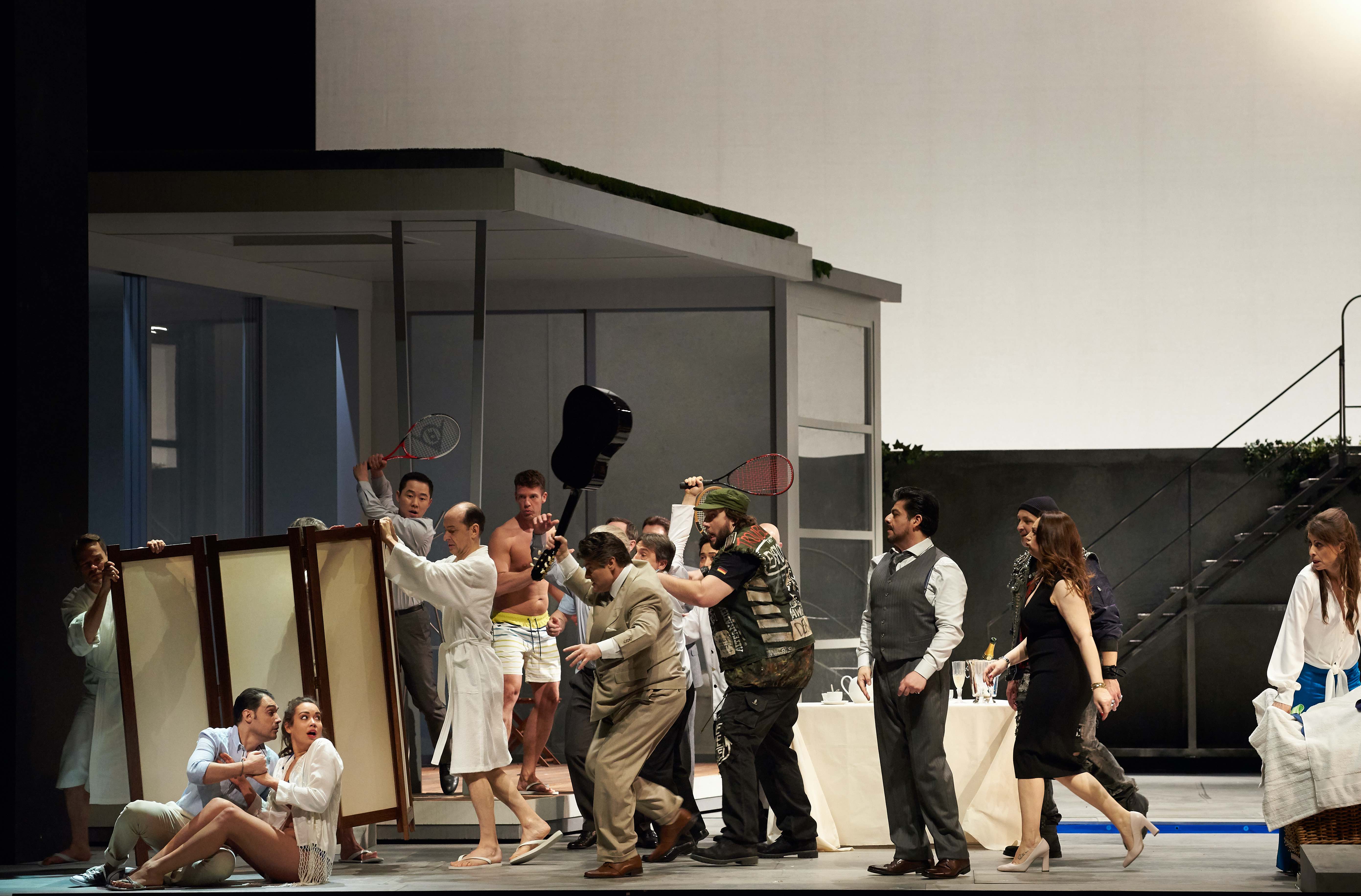 Des femmes, aucune n'hésite à se montrer en tenue d'été dans cette mise en scène. La maison des Ford bénéficie en effet d'une belle piscine de jardin, pour laquelle la production apporte également son lot de figurants masculins bien dessinés, qui ajoutent au comique du livret. Entre bikini et peignoir, Nadine Sierra livre une Nannetta espiègle et frivole, magnifique dans tout le registre, jusqu'à un aigu subtil, moins brillant qu'il y a quelques années. La gravité de son air de fin, en robe blanche pour produire un effet spectral à son apparition, montre la maturité de l'artiste (également Sophie en ce moment dans la nouvelle production straussienne de Berlin).