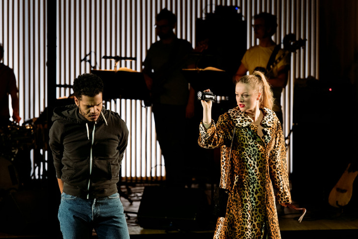 Côté voix, tous parés de leur micro-tête, les chanteurs composent une distribution homogène sans fausse-note, même si l'on est plus touché par la sensibilité de Clémence Poussin qui excelle dans son solo (Consuelo's Dream), et par la rigueur du chant d'Aaron O'Hare qui campe un policier froid et distant. Aucun pourtant ne démérite, sans pour autant marquer les esprits. L'ensemble qui donne son titre à l'œuvre, découlant pleinement de l'art minimaliste de John Adams, reste lui dans la tête, telle une chanson obsédante.