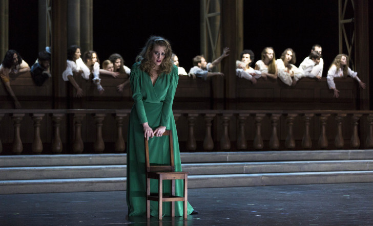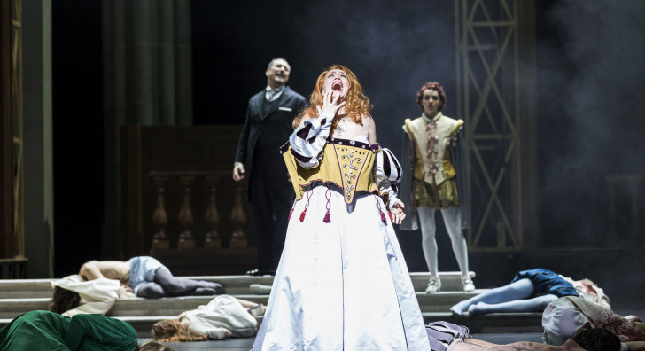 Chez les dames, l'entrée de la mezzo-soprano Lea Desandre (Urbain) est un bienfaisant bain de fraîcheur dans une ambiance qui tendait alors vers une certaine morosité. Son « Nobles seigneurs, salut ! » montre outre la comédienne pimpante, une chanteuse dont la voix, même s'il elle est d'une puissance limitée, s'affirme d'une agilité et d'une coloration peu commune. Au début du deuxième acte, avec l'air « Ô beau pays de la Touraine » on s'attend aux feux d'artifice vocaux que l'histoire de cet opéra a laissé avec les Joan Sutherland et autres Beverly Sills. Mais Ana Durlovski (Marguerite de Valois) reste assez éloignée de ces références quand bien même la soprano possède une belle agilité vocale. On espère qu'elle osera la folie dont nous avions ressenti l'existence dans sa Reine de la Nuit à l'Opéra de Lausanne en mars 2010, mais le déclic n'opère pas. On se contentera de trop sages vocalises noyées dans une diction incompréhensible. Dommage, le talent est là. C'est avec la soprano américaine Rachel Willis-Sørensen (Valentine de Saint-Bris) qu'on a les meilleurs moments de la soirée. Dans un français parfaitement articulé, la jeune soprano allie la distinction des phrasés à l'humanité de son personnage. Et pour incarner tout ça, elle possède une voix, une puissance expressive, une justesse de son, des nuances de grande dame du chant. En parfaite symbiose musicale avec John Osborn (Raoul), elle habite la scène avec des accents tragiques nimbés de terreur et d'amour dans le plus pur esprit du grand-opéra.