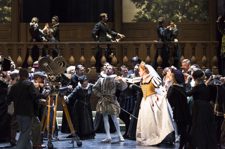 À Genève, on a voulu rendre hommage à la fois à l'Histoire et au grand-opéra. Pour cet immense défi, on a fait appel aux metteurs en scène Jossi Wieler et Sergio Morabito dont la chronique genevoise avait pu s'offusquer de leur mise en scène de Norma de Bellini en juin 2017. Point de scandale ici mais une conception scénique sans grandeur. Malheureusement, au lieu de se borner à raconter ce que le livret nous dit, les deux metteurs en scène ont imaginé une transposition de l'action dans le milieu du cinéma hollywoodien des années cinquante. Certes, les canons du grand-opéra pourraient se rapprocher de cette époque artistique mais encore faut-il qu'une idée (celle du cinéma) tienne la route pendant les plus de quatre heures de spectacle. Or, ce n'est pas le cas. En mélangeant les époques, avec des parodies de Charlot, les westerns côtoyant les robes de cour, avec des décors rappelant la cathédrale de Genève avec ceux d'un poste de maquillage, le retour des échelles (si prisées de toutes les mises en scènes des années 2000) avec un tréteau servant tour à tour de chaire d'église (montant et descendant pour admirer la machinerie fonctionnelle du théâtre genevois) et de scène à un French cancan, tout est parasite et explosion d'images n'apportant rien au récit, ni à l'intrigue.