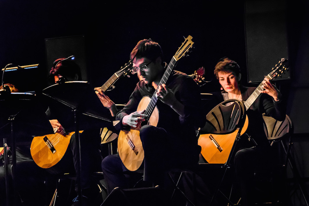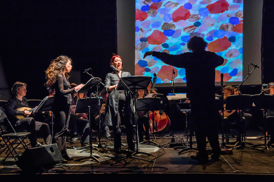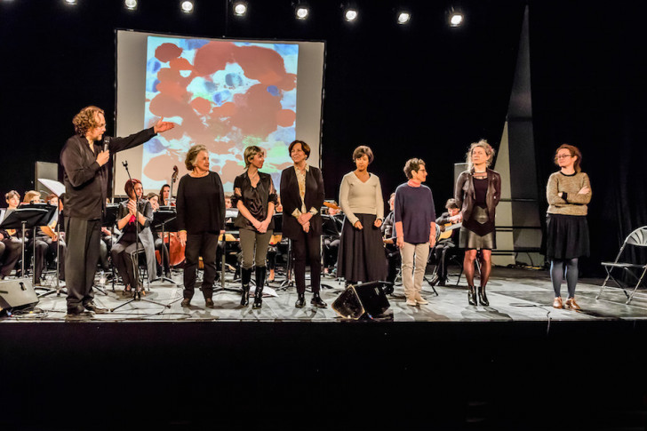 Les cerises de Claire-Mélanie Sinnhuber mettent en scène « ce vivace et ce bel aujourd'hui » de l'écrivaine, en confiant le texte aux deux chanteuses : refrains joyeux des cordes pincées, percussion sur la caisse des instruments, humour et enfantillages des voix qui dialoguent dans un contexte très pulsé et soumis aux aléas de fins mécanismes qui menacent de se dérégler. Les voix, celles des instrumentistes tissant la dramaturgie, sont chuchotées dans Je suis Marina T (Marina Tsvetaeva) qui inspire à Ivane Béatrice Bellocq une musique tout en contrastes, entre tension (Pizz Bartók des guitares, claquement du fouet dans les mains du chef) et filtrage du matériau, pour terminer la pièce de manière très suspensive. Le titre emprunté à Virginia Woolf, Comme un nuage sur les vagues… croise la thématique de l'eau et de la mer chère à Édith Canat de Chizy. Le courant passe entre les pupitres et une énergie vibratoire nait sous les plectres des mandolines. Les glissandi ascendants des guitares et les contrepoints de lignes génèrent des textures mouvantes rejoignant l'idée de « joie divine et de jaillissement » dont nous parle Lydie Salvayre au sujet de la poétesse anglaise ; même si l'obsession d'un rythme iambique (brève-longue) frappé sur la caisse des guitares confère à la trajectoire sa dimension tragique. On retrouve la voix de Mareike Schellenberger dans Certains aiment la poésie, un texte de la Polonaise Wislawa Szymborska mis en musique par la compositrice franco-polonaise Joanna Bruzdowicz. La ligne de chant expressive, voire sensuelle, s'inscrit sur une partie instrumentale colorée et vibrante qui suit de près la trajectoire vocale aussi courte que concentrée. Si les conditions acoustiques quelque peu difficiles de l'Atrium, malgré l'amplification de l'ensemble, n'ont guère mis en valeur la contrebasse dans les pièces précédentes, elle est centrale dans L'Homme qui marche de Michèle Reverdy, exposant en pizzicato le thème conducteur que la compositrice fait revenir sous des habillages et contextes sonores différents : une paraphrase musicale du texte de Lydie Salvayre, « Marcher jusqu'au soir », qui boucle ce voyage immersif au cœur de la création.