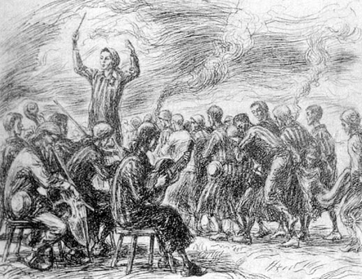 A Auschwitz, la musique était également présente, des orchestres de déportés jouant devant des parterres de SS. Un orchestre féminin y fut créé en 1943, Alma Rosé, nièce de Gustav Mahler, en prit la direction. Regroupant, autour d'elle, une cinquantaine de musiciennes venues de tous horizons, Alma Rosé sut convaincre les nazis de lui fournir des rations supplémentaires, une baguette et une estrade, pour diriger des fragments de marches militaires, le premier mouvement de la Symphonie n° 5 de Beethoven, certains passages de la Symphonie du Nouveau Monde de Dvořák, ainsi qu'une transcription de Träumerei de Schumann, à l'attention de Mengele qui en raffolait. « Elle vivait dans un autre monde, pour elle, la musique était l'écho de son amour, de ses déceptions, de ses chagrins, de ses aspirations éternelles, de sa foi, et c'est cette musique là qui flottait dans l'air, au dessus du camp ». Une obsession, apparemment vaine, pour échapper peut être à la folie ? Alma Rosé mourut en 1944, dans des circonstances qui demeurent controversées dont on ne peut exclure le fait quelle fut éventuellement victime d'expérimentations…mais nombre de ses musiciennes survécurent à l'horreur nazie.