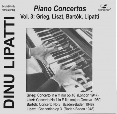 Le troisième volume commence avec le Concerto pour piano en la mineur d'Edvard Grieg. Voici encore une autre interprétation considérée comme une référence, que nous trouvons légèrement plus électrisante dans les repiquages faits en vue de l'édition en SACD hybride par Warner au Japon (Archiphon prit comme source un microsillon Columbia). Le Concerto pour piano n° 1 de Franz Liszt est transféré depuis les disques acétate hérités de Madeleine Lipatti, la veuve du regretté musicien. La prise de son permet de percevoir, en dépit d'un bruit de fond sensible, le rayonnement du jeu de Lipatti, sa pureté comme son éloquence. Ajoutons que ce concerto fut, à côté de celui de Chopin, le plus souvent exécuté en public par le pianiste. Il nous reste des gravures du Concerto pour piano n° 3 de Béla Bartók et du Concertino dans le style classique de Lipatti lui-même, reportées depuis une bande magnétique. Il s'agit d'un enregistrement radiophonique sans public, de 1948. Lipatti impressionne par sa poésie, la fulgurance du geste. Il n'en va pas de même avec la direction de Paul Sacher qui ne réussit pas à animer le mouvement, rendre le discours cohérent, ni d'ailleurs à faire ressortir de l'Orchestre symphonique de la SWR de Baden-Baden autant de couleurs que Hans Rosbaud.