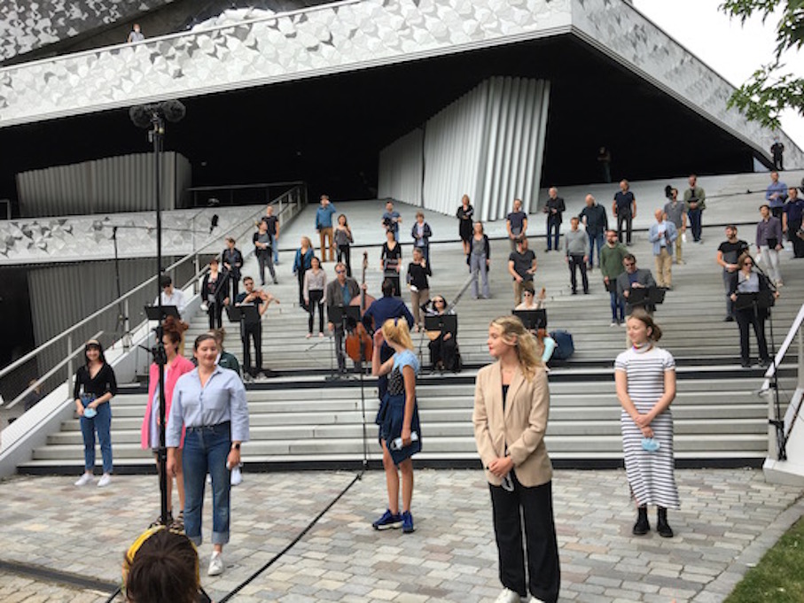 On fait quelques pas en direction de la Grande salle de la Philharmonie pour retrouver, sur l'escalier monumental, la Cappella Mediterranea et quelques chanteurs d'Accentus sous la direction du chef argentin Leonardo Garcia Alarcón, maître d'œuvre de ce Happening. Le ministre de la Culture, Franck Riester, dûment masqué, coudoie un public certes restreint mais à l'écoute, heureux, comme nous le sommes, d'entendre les voix du chœur accompagnées de quelques instrumentistes – violons, viole de gambe, luth, flûtes et cornets à bouquins, etc. – dans leur répertoire de prédilection. Deux pièces vont être données en boucle, une heure durant, avec une mise en espace assez impressionnante. A cappella, pour débuter le concert, c'est Leonardo García Alarcón lui-même, face au public, qui entonne la chanson populaire bien connue Bella Ciao, encourageant l'auditoire à le suivre, avant l'arrivée du chœur, masqué, descendant les marches pour relayer le chef et donner cette fois tous les couplets de ce chant de révolte italien sous sa direction. Les musiciens enchaînent avec l'Ave Maria de Giovanni Giorgi, une pièce vocale polyphonique accompagnée par les instrumentistes et superbement rendue malgré des conditions climatiques incertaines.