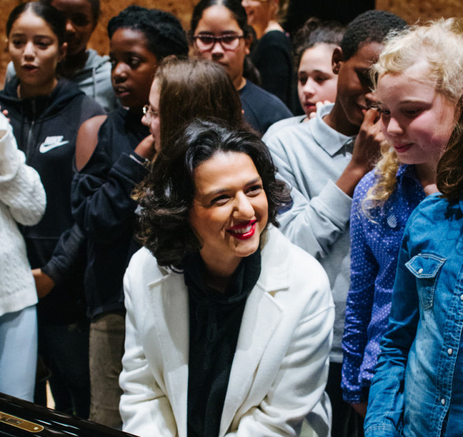 Le masque est obligatoire pour l'entrée dans la Grande salle de la Philharmonie où l'auditoire est invité à respecter les distances sanitaires. Une fois assis, chacun pourra, ou non, enlever son masque. Participatif lui-aussi, le concert débute par une « mise en voix » du public, emmenée par la cheffe Elisabeth Coxall et ses deux assistantes très impliquées. Le but est de faire réagir les voix aux gestes des performeuses et, in fine, de faire jouer-chanter la salle et l'orchestre dans le temps d'une improvisation, autre happening fort bien conduit par les trois jeunes femmes en parfaite synergie. Arrive alors la pianiste Khatia Buniatishvili, marraine de ce projet. Didactique toujours, la cheffe explique les tenants et aboutissants du célèbre Canon de Pachelbel avant de le diriger aux côtés de la pianiste qui en réalise les différentes « diminutions » (entendez les variations). Les enfants de l'Orchestre Démos (dispositif d'éducation musicale et orchestrale à vocation sociale, rappelons-le), en petit effectif, tiennent leur partie sans faillir, encadrés par les professionnels qui les ont coachés.