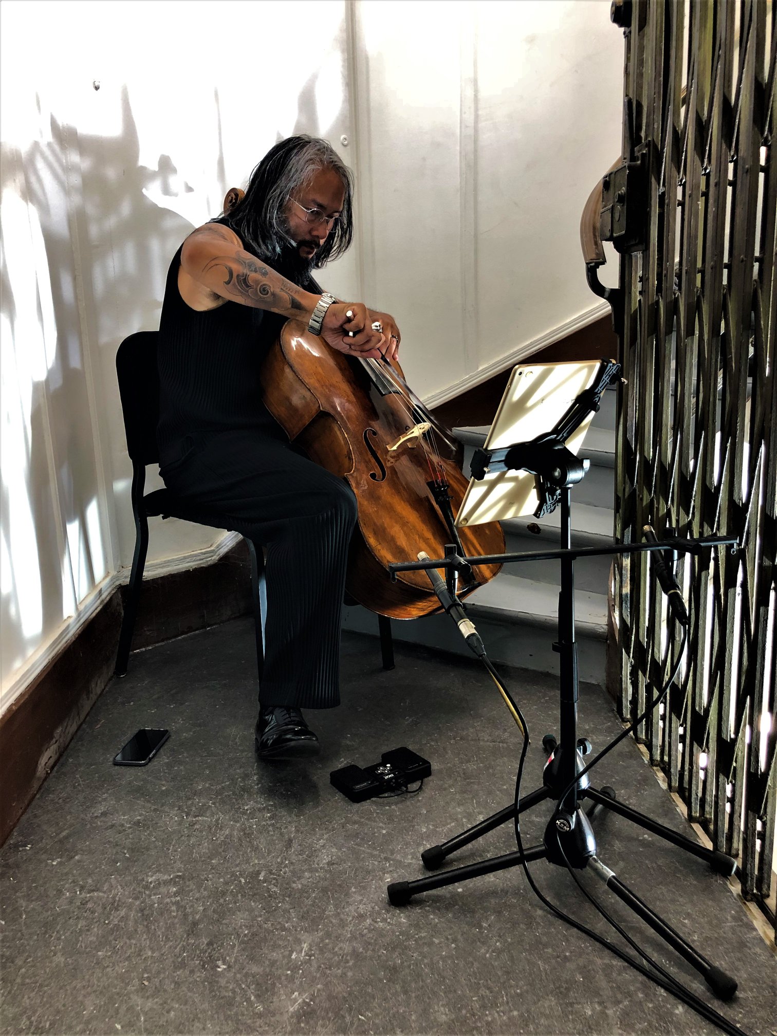 Ainsi ces trois solos superbement mis en valeur : la trompette de Lucas Lipari Mayer, tout d'abord, dans Without words, une pièce d'une grande sobriété de la compositrice turque Zeynep Gedizlioǧlu sondant en finesse les richesses timbrales de l'instrument à travers différents modes d'émission. La pièce « coup de poing » de Luca Francesconi pour violoncelle, Secousse-Action, est jouée au bas de l'escalier face à l'ascenseur par un Éric-Maria Couturier en grande forme et en tenue estivale. La pièce sollicite la voix du performeur ainsi que son sifflement rejoignant la qualité des harmoniques de l'instrument dans une exploration sonore risquée. Solo, c'est le titre choisi par Bastien David qui se confronte au grand Steinway de concert joué par Dimitri Vassilakis. Le registre aigu de l'instrument a été « préparé » et fait valoir son aura percussive dans cette pièce inventive et sensible qui dialectise les notions de répétition et de changement. Mais d'ou vient cette fréquence exogène et insistante entendue en fin de partition ?