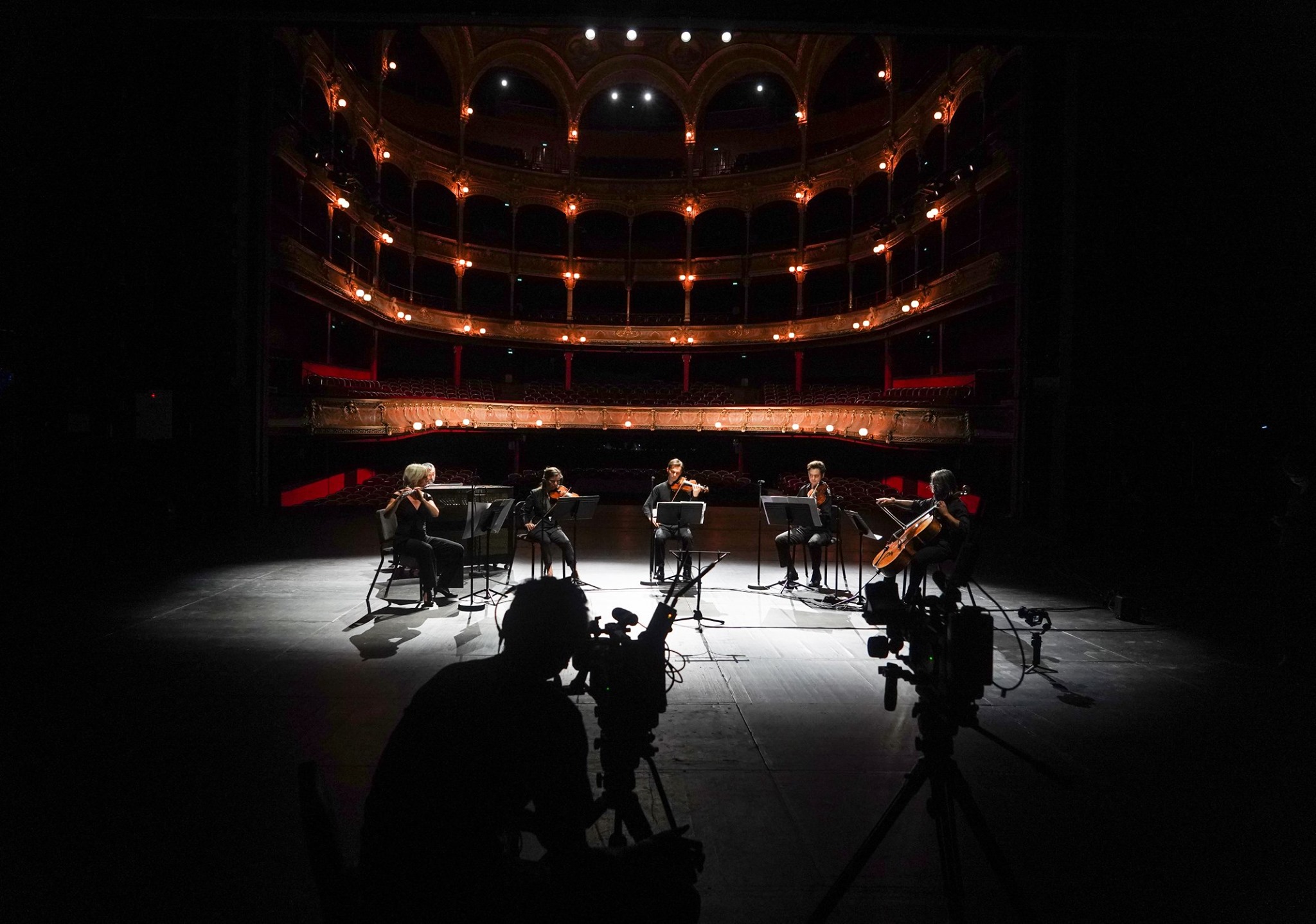 À ce titre, dix-huit créations sont à l'affiche de la soirée, que les Solistes de l'EIC donnent dans les murs du théâtre et que le film, réalisé par Renaud Rubiano, nous restitue en différé. Ils étaient au départ vingt compositeurs – deux commandes n'ont pas été honorées – à avoir été sollicités courant mai par l'EIC pour écrire des pièces courtes (de 3 à 10 minutes) et à effectifs réduits (du solo au nonet) : une initiative sans précédent, baptisée « RE-création », pour réinvestir les territoires du son mais dans le respect des mesures sanitaires. Si la sélection a pris une envergure internationale, avec une dizaine de noms hors Hexagone, la représentation féminine reste bien faible, la liste ne mentionnant que trois compositrices, Olga Neuwirth, Nina Šenk et Zeynep Gedizlioǧlu : soit elles n'ont pas été contactées, soit elles n'ont pas répondu à l'appel… En revanche, la relève semble assurée avec six compositeurs de moins de quarante ans qui coudoient leurs aînés, Peter Eötvös, le vétéran, Philippe Manoury, Luca Francesconi, Philippe Schoeller et Pierre Strauch, violoncelliste dans les rangs de l'EIC depuis 1978 et compositeur fêté par ses collègues à l'heure de son départ.