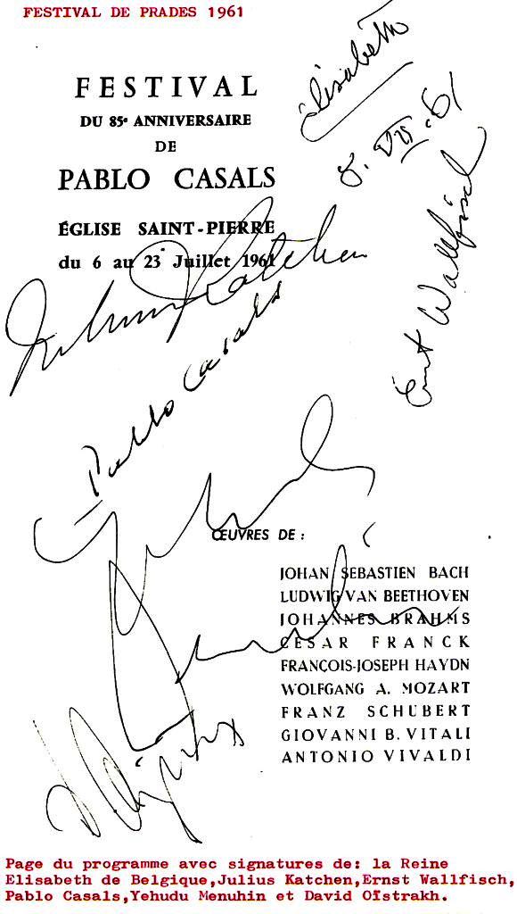 Ce Festival de Prades, qui existe toujours sous le nom de Festival Pablo Casals reste parmi ces souvenirs d'enfance qui marquent à vie. Mon grand père, musicien et républicain espagnol, exilé avec sa famille depuis l'Andalousie s'était rapproché de Pau Casals et de son combat pour la liberté. Ce festival était l'occasion unique d'approcher le Maître ainsi que tous les musiciens exceptionnels qu'il faisait venir à Prades. Durant plusieurs années, mes parents me firent découvrir un monde merveilleux qui pour eux, après les douleurs de la guerre apportait paix et réconfort. Casals ne disait-il pas lui même : » La musique chasse la haine chez ceux qui sont sans amour. Elle donne la paix à ceux qui sont sans repos, elle console ceux qui pleurent « . Ainsi à l'âge de sept ans, je rencontrais Casals, assis avec sa pipe légendaire sur un vieux fauteuil épiscopal de la sacristie de l'église de Prades, serrant chaleureusement mes petits mains et me donnant sa bénédiction pour mon amour naissant de la musique. Ce soir là, David Oïstrakh et Julius Katchen jouèrent avec lui un programme Beethoven. Je me souviens encore de la fascination qui fut la mienne d'observer tous ces doigts en action, sur la touche du violon, du violoncelle et sur celles du piano. Par la suite je revins souvent écouter les concerts du festival qui se tenait désormais dans la nef restaurée de l'abbaye de Saint-Michel de Cuxa proche de Prades. Yehudi Menhuin, Nikita Magalov, Kurt Redel, Alexis Weissenberg, autant de virtuoses entourant Casals ne jouant plus car devenu très âgé, mais toujours là, charismatique et rayonnant.