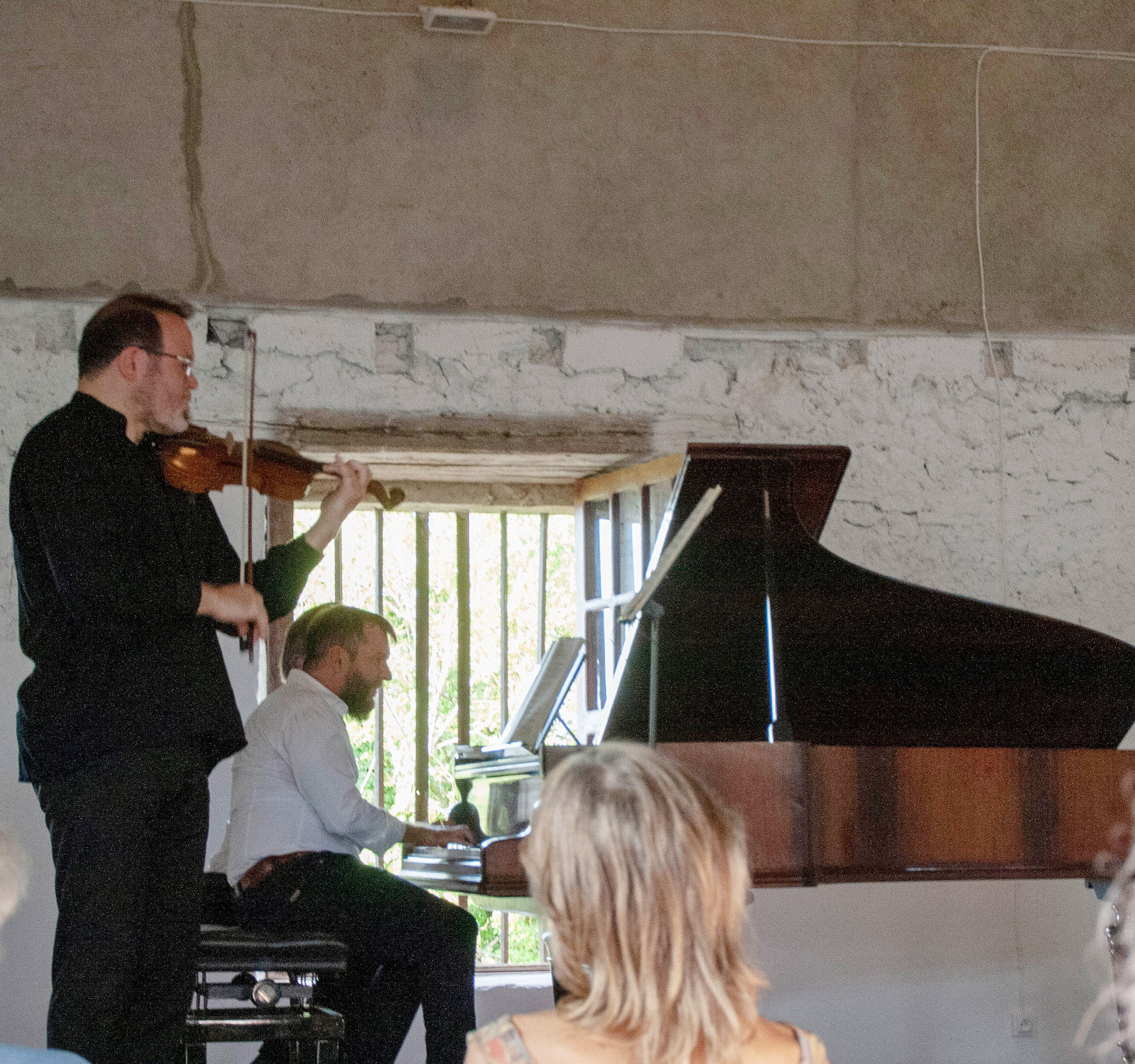 C'est à 15 heures, en extérieur par 35° C, heureusement à l'ombre que les « Deux salonnards » Emmanuel Balssa et Sébastien Renaud faisaient découvrir la musique romantique de salon pour deux violoncelles. Une grande Suite pour deux violoncelles de David Popper succède à une Sarabande de Julius Klendel, précédée de trois Études d'Auguste Franchome et d'une pièce de Joseph Abaco, qui avait traversé tout le XVIIIe siècle. Emmanuel Balssa et Sébastien Renaud disent naturellement quelques mots sur ces compositeurs méconnus, citent des anecdotes et ponctuent leur intervention de réflexions piquantes de Berlioz, qui était un critique acerbe de la vie musicale à Paris sous la Monarchie de Juillet.