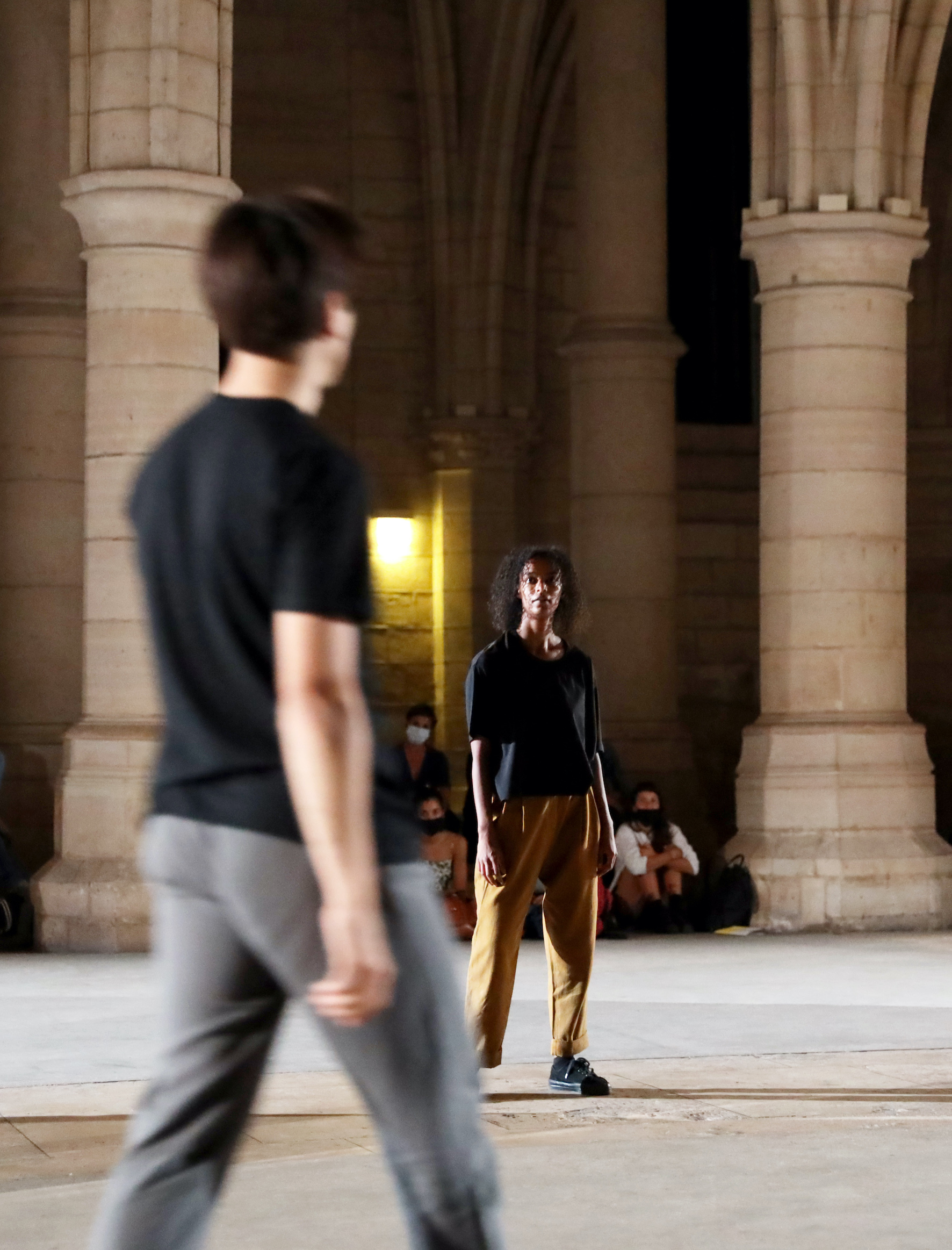 Le très vaste espace vouté de la salle des Gens d'arme de La Conciergerie convient particulièrement bien à la distanciation physique en ces temps de Covid-19. Les six interprètes de Passages parcourent un rectangle dont les principaux obstacles sont les piliers épais qui masquent aux spectateurs, assis à bonne distance tout autour, une partie de l'action.
