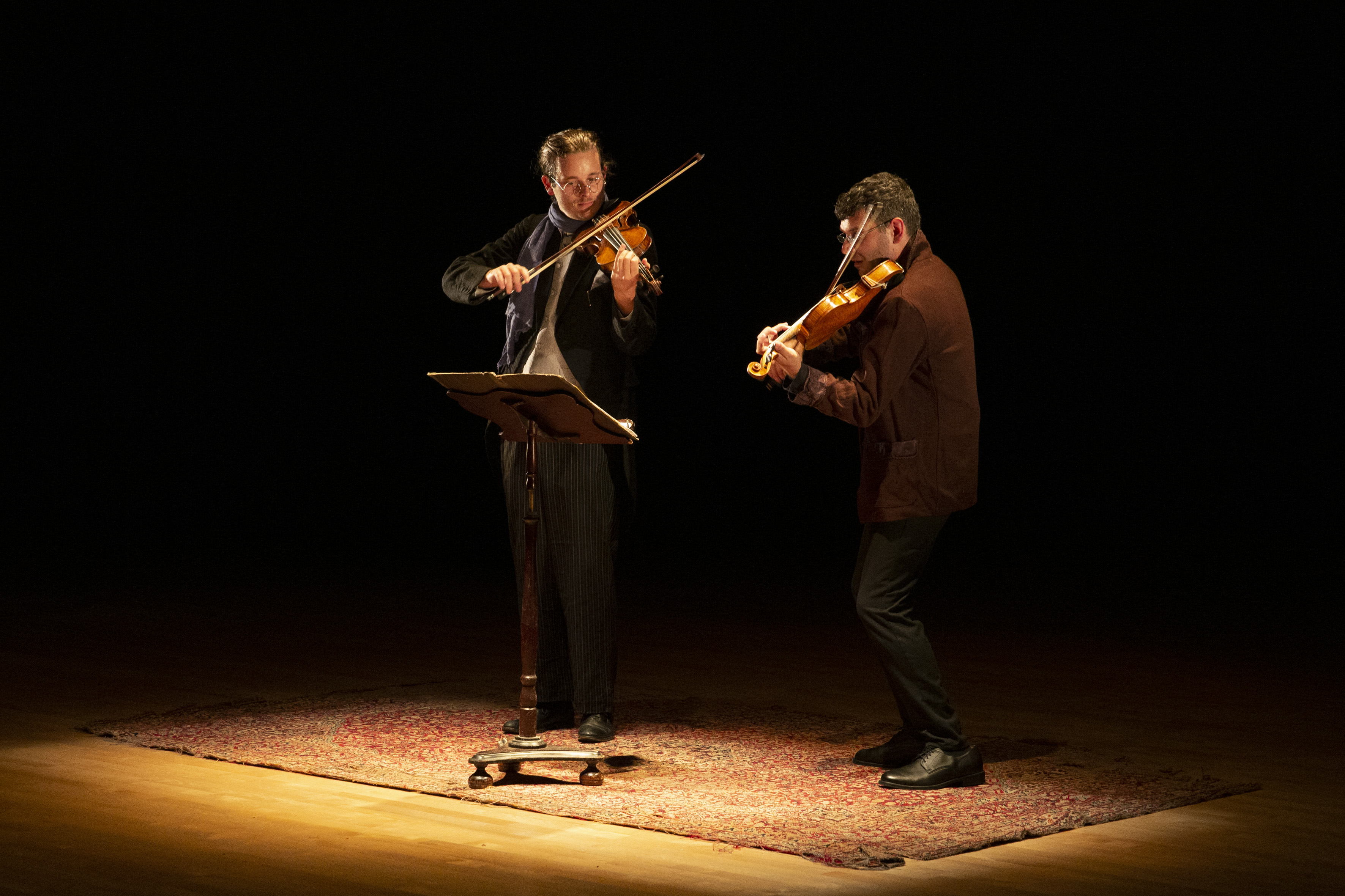 Dans l'Auditorium Jacques Kreisler de la Cité des Arts, la Compagnie Bacchus présente Exil pour deux violons, un spectacle d'une heure dix autour de l'exil de Bartók aux États-Unis en 1940. Jean Pétrement, fondateur de la compagnie, est Bartók. Un Bartók qui se définit comme le cousin de Debussy et Ravel plutôt que le frère de Beethoven et Wagner, et qui, honteux d'appartenir à sa classe, n'aura de cesse de faire chanter l'âme populaire de son pays, comme dans ses 44 duos pour deux violons (dont une petite trentaine cimentent le spectacle), suite de thèmes populaires recueillis en Europe de l'Est et en Afrique. Clément Wurm et Léonard Stefanica, violoniste et comédiens, bien décidés à prouver que « celui qui veut vraiment sentir la pulsation de cette musique doit en quelque sorte la vivre… », nous conduisent avec un vibrant talent dans ces miniatures que le compositeur hongrois qualifia de « modèles de perfection artistique ».