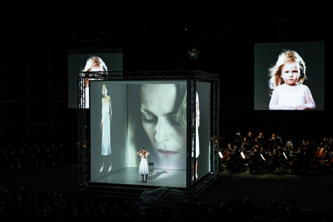 Optant pour la sobriété et l'épure, Calixto Bieto place l'unique personnage de ce conte dans un cube aux parois blanches, une sorte d'écrin protecteur dont la perspective et l'espace se transforment constamment sous les effets de la vidéo, celle, métaphorique, de Sarah Derendinger (les mains ridées de la mère, la chouette solitaire) ou beaucoup plus incarnée lorsqu'elle filme la naissance de l'enfant sur un fond sonore de berceuse. L'orchestre sur scène est en arrière-plan tandis que le chœur, placé de part et d'autre de la structure scénique, viendra chanté sur le devant du plateau.