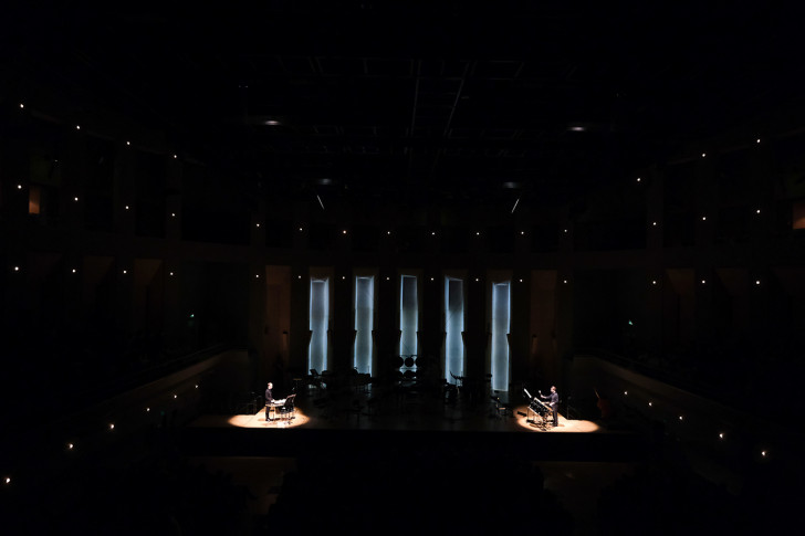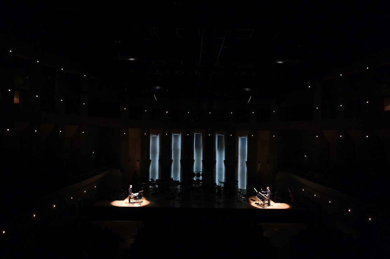 Deux grosses caisses sont installées sur le devant de la scène, à cour et à jardin, pour l'exécution de Stèle, une pièce aussi courte que fulgurante écrite en 1995 in memoriam Dominique Troncin. L'œuvre s'amorce par du bruit blanc, Samuel Favre frottant la peau de son instrument avec une brosse avant même l'arrivée de son partenaire Gilles Durot : un phénomène bruité cher à Grisey pour capter l'écoute (ou faire en sorte qu'elle ne se relâche pas entre les mouvements) qu'il met à l'œuvre dans les deux autres partitions du programme. Deux voire trois temporalités se superposent dans Stèle, entre coups secs et scansion implacable à jardin, écho vibrant et résonance profonde à cour. L'effet est saisissant autant qu'indicible, qui trouvera son écho dans Quatre chants pour franchir le seuil. Stèle est la première manifestation de ce « vertige de la durée pure » auquel est convié ce soir le public. Œuvre d'envergure en trois mouvements, Vortex Temporum (Tourbillon de temps) pour piano et cinq instruments en est la seconde, une partition de la même année 1995 qui semble sonner différemment selon que l'œuvre est dirigée ou non.