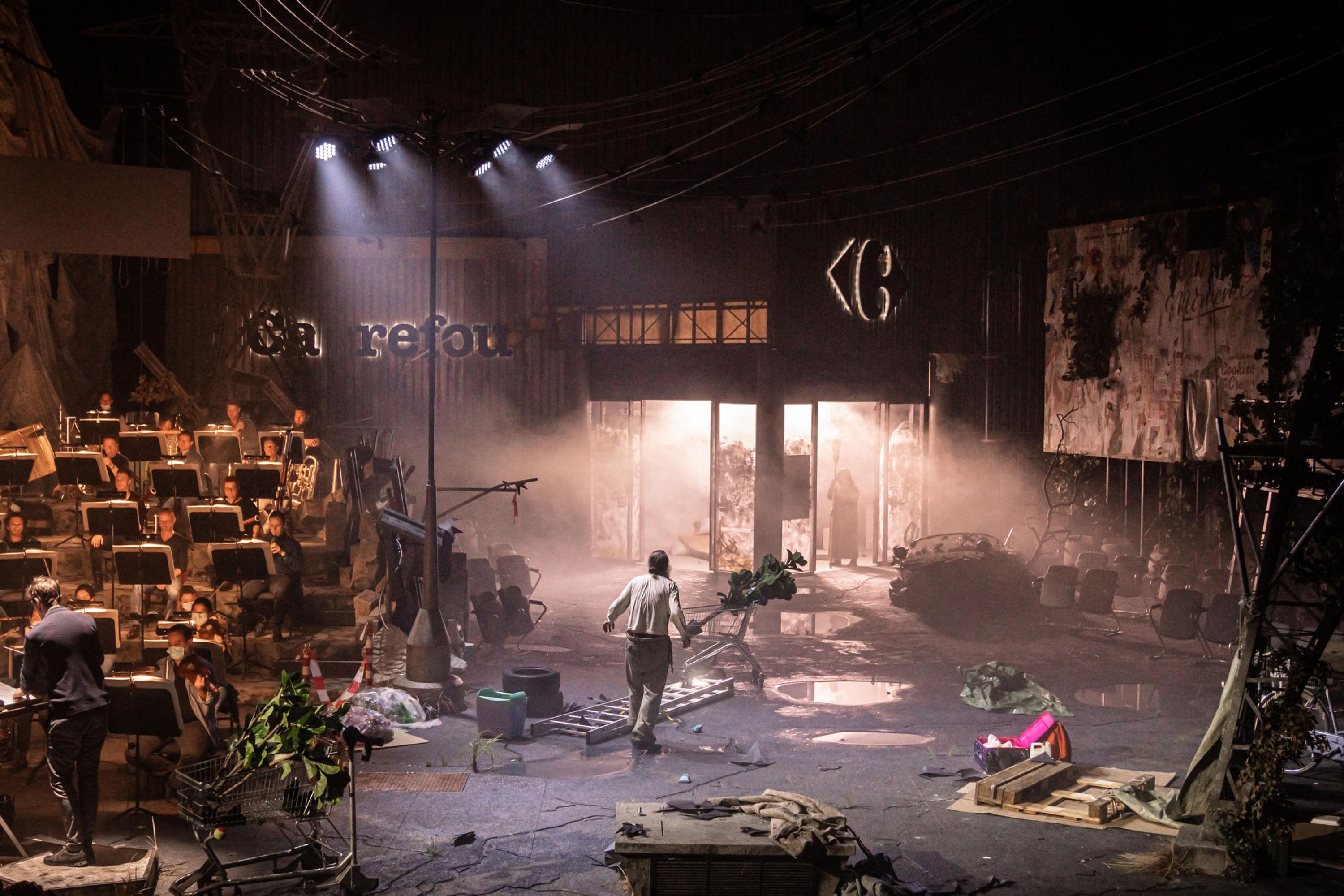 Quel choc saisissant que celui d'un théâtre dévasté ! En pénétrant dans le Theater Basel, le spectateur ne peut s'empêcher de songer aux six mois d'inactivité subis par un des opéras les plus stimulants d'Europe. C'est le paysage d'une déflagration qui s'offre à sa vue. Une enseigne désaffectée au fond d'un parking planté de pylônes électriques. L'un se dresse même dans la salle, revue en autoroute désertée, que dominent graffitis délavés et panneaux directionnels périmés. Une anxiogène rubalise matérialise la distanciation des fauteuils rescapés, les autres, ayant franchi un quatrième mur lui aussi victime collatérale du cataclysme, accueillant à cour quelques spectateurs dont les masques parachèvent le sentiment de désolation. A jardin, un escalier de pierre recueille l'orchestre. Ces vestiges de l'insouciance révolue d'un temps consumériste sont le couvent de François, loque humaine traînant comme sa croix d'amples sacs de commissions, faisant ses ablutions matinales dans les flaques d'eau, ses illuminations tentant de donner un sens à ce quotidien déplorable, naviguant entre humour gras (les frères bâlois n'irradient pas la spiritualité) et confection d'origamis ailés. Car, dans ce monde post-tsunami (comme l'indique un hors-bord échoué sur le plateau) il n'y a plus d'oiseaux !