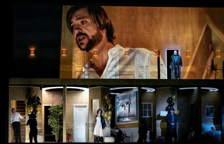 Bien qu'à l'image, la caméra frustre par son addiction à de réducteurs plans de biais comme à des plans de face que leur souci d'inclure la fosse dans le champ rend trop lointains, l'appétit d'opéra de Fabrice Murgia est manifeste. Le metteur en scène semble d'ailleurs parler aussi de lui lorsqu'il dit que Rossi « avait attendu le moment de pouvoir donner une forme à l'explosion paroxystique de son talent, en créant un spectacle total, monumental, inoubliable ». Par bonheur, alors qu'en 1642, à Rome, la création fut lestée de l'échec de machines de scènes compliquées, en 2020, il en va autrement du tourbillonnant dispositif (monté sur trois tournettes !) d'un lieu en perpétuelle mutation, sur lequel vient se poser le premier étage d'un couloir hôtelier tagué de visages saisis par des caméras de vidéo-surveillance en direct. C'est là qu'Atlante attire et confine ses victimes. Il n'est pas interdit de voir dans ce tenancier d'un Eden conçu pour la Chute, la métaphore d'un créateur qui se réjouirait de voir se débattre sous ses yeux les êtres qu'il a créés imparfaits. De fait un palais plus désenchanté qu'enchanté. Que par un très signifiant effet de dépouillement (avec vidéo ayant viré au noir et blanc), l'Acte II montre abandonné comme une station-service désaffectée, avant que ne subsiste dans les airs la poésie phosphorescente d'une poignée de fenêtres et de portes (dont celle de l'emblématique chambre 1642). Au III, le palais n'est plus qu'un souvenir pour l'ensemble des protagonistes qui, enfin réunis, se rejoignent pour chanter et danser à reculons la longue et irrésistible péroraison finale, jusqu'à disparaître dans la brume.