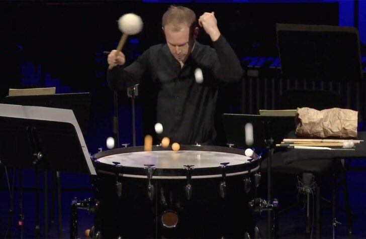 Première des trois créations mondiales à l’affiche, Mono-drum, solo pour grosse caisse de la compositrice et percussionniste polonaise Agata Zubel, est une exploration virtuose autant que subtile de l’instrument, menée avec une maîtrise infaillible par Gilles Durot. Pas de tonitruance ni de pulse sauvage à la Xenakis. L’interprète a dans les mains deux balais (puis deux aiguilles à tricoter) pour tester « l’objet sonore » tous azimuts, sur la peau frottée et percutée mais aussi le métal de l’armature et les flancs du gros instrument : ça vibre, ça claque, ça crépite. Particulièrement ludique est cette séquence frissonnante avec les balles de ping pong projetées sur la caisse et le mode aléatoire de leur rebond : le tout est réalisé dans une frénésie rythmique et un continuum vibratoire qui captivent l’oreille autant que le regard. Entrelacs pour six instruments de Yan Maresz est une partition inscrite au répertoire de l’Ensemble qui l’a gravée en 2005. Elle se déploie en un flux sensible et obstiné (les motifs circulaires du piano sur des polarités très affirmées) auquel Matthias Pintscher donne toute sa souplesse et son élégance.