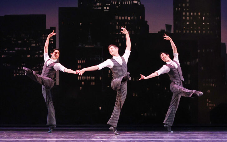 Entrée pétillante en diable avec Who Cares ? de George Balanchine sur une musique évoquant Broadway de George Gershwin, sur fond de décor nocturne de gratte-ciels. L’atmosphère est celle d’un « musical », avec des séquences successives de cinq filles puis cinq garçons, avant un duo langoureux de Jessica Xuan et Martin ten Kortenaar sur The man I love, puis trois solos avant un final à l’unisson, très punchy. Les costumes ancrent le ballet dans les années 30, époque mafia et flappers, avec petit gilet pour les hommes et robe à rubans pour les femmes. Il ne manque plus dans Stairway to paradise que les claquettes, même si la petite batterie et les tours en l’air de Nina Tonoli font illusion. C’était pour Balanchine un sacré défi que d’intégrer les difficultés techniques de la danse académique (tours, sauts, diagonales) dans le rythme et l’esprit jazzy de la musique de Gershwin. Restait aux danseurs à y ajouter la nonchalance et la décontraction inhérente à ce style, en s’inspirant de Gene Kelly ou de Ginger Rogers. Et certains y parviennent avec beaucoup d’allure !