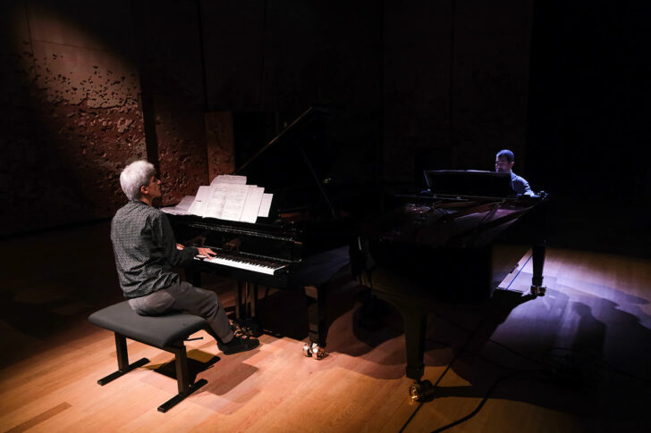 Tous deux solistes de l'Intercontemporain, Hidéki Nagano et Dimitri Vassilakis sont face à face dans les Structures (Livre II), une pièce en deux « chapitres » – référence au Livre de Mallarmé – que Pierre Boulez, au côté d'Yvonne Loriod a créé en 1961 au festival de Donaueschingen. L'œuvre est écrite presque dix ans après les redoutables Structures (Livre I) visant « l'impersonnalisation » maximale du langage à travers l'usage de la série appliquée à tous les paramètres de l'écriture. Le Livre II participe, quant à lui, de l'expérience de « l'œuvre ouverte », accordant aux interprètes une certaine liberté dans le parcours formel et leur intervention respective : c'est une musique éruptive, brillante et constamment mouvante qui s'incarne sous les doigts experts de nos deux pianistes en une jubilation sonore où tous les registres de l'instrument sont exploités. Plus séduisant encore sous le geste virtuose des deux interprètes, le second « chapitre » fait la part belle au piano I (Dimitri Vassilakis) avec une « musique-oiseau » incandescente – Messiaen demeure – investissant les aigus du clavier. Le jeu duel allie geste rageur, traits fulgurants et magie de la résonance. La toccata finale du piano I, en conflit avec les blocs-accords du piano II, génère un affrontement spectaculaire, Dimitri Vassilakis sollicitant cette fois les résonances profondes de l'instrument jusqu'à saturation de l'espace sonore.