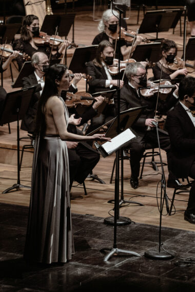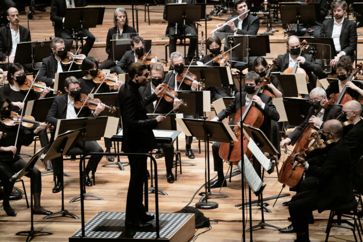Place aux cuivres d'abord avec Initiale, une pièce courte (5′), rarement donnée, de Pierre Boulez qu'il compose pour les États-Unis en 1987. Les instruments, deux trombones, deux cors et deux trompettes, sont distribués symétriquement autour du tuba, permettant des effets d'écho et de spatialisation qu'aime envisager le compositeur de Répons. Voilà une superbe entrée en matière, virtuose et bien sonnante dans l'espace de la Philharmonie. L'orchestre, au complet cette fois, enchaîne avec Les offrandes oubliées d'Olivier Messiaen. Le compositeur a vingt-deux ans lorsqu'il écrit cette « Méditation symphonique » en trois volets dont Mäkelä accuse les contrastes. La partie centrale, avec les sifflements stridents des cordes en harmoniques est presque violente sous sa baguette alerte. Elle s'oppose au temps suspendu des deux autres parties, plages d'un extrême raffinement laissant apprécier la beauté des cordes vibratiles, seules dans l'extatique finale où passe l'émotion.