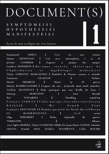 Pluridisciplinaire et libre, Document(s) est la nouvelle publication initiée par le Projet Bloom dans le prolongement de L'Autre musique, revue numérique portée par Frédéric Mathevet et Celio Paillard : pas de thématique ni de démarche musicologique mais un ensemble de réflexions et de questionnements qui fait sens autour de la création artistique, invitant compositeurs, plasticiens, philosophes et hommes de plume.